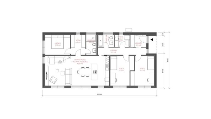 Všechny tyto místnosti disponují přímým vstupem na zahradu. Na straně druhé je zádveří, technická místnost, koupelna a také tzv. rodičovský blok.