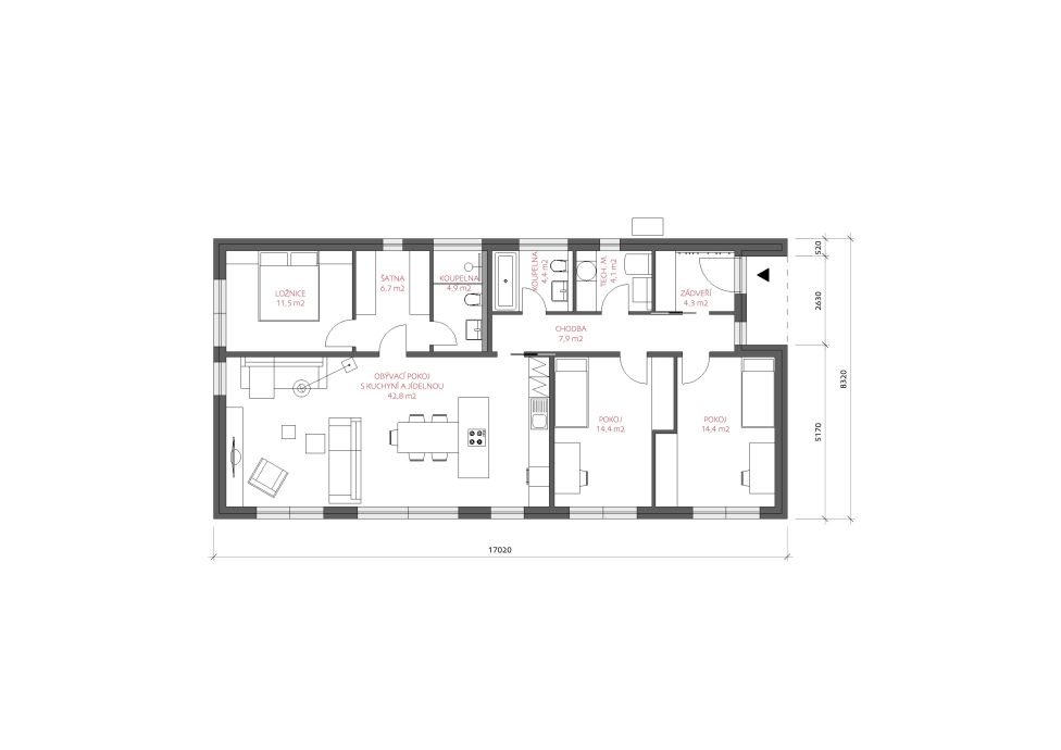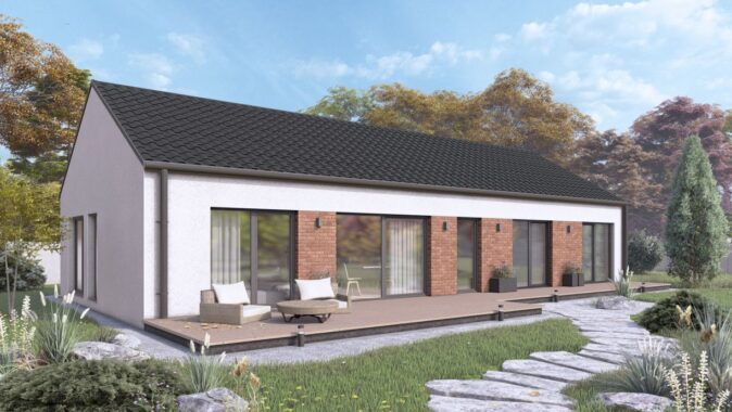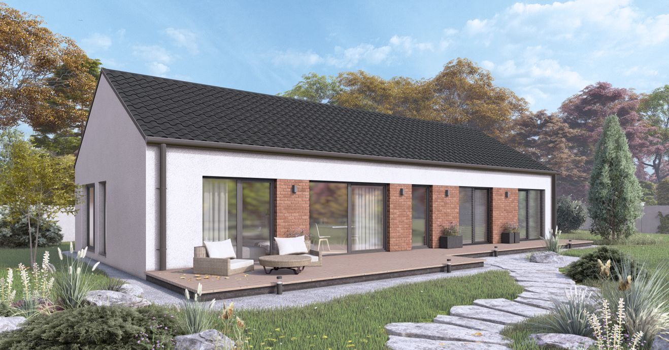 Našimi klienty velmi oblíbená oddělená část domu s ložnicí, vlastní šatnou a koupelnou, do kterého se vchází přes obývací pokoj. V ceně tohoto domu je fasáda tvořená omítkou v kombinaci s cihlovým obkladem.