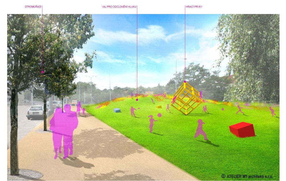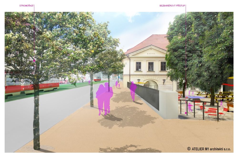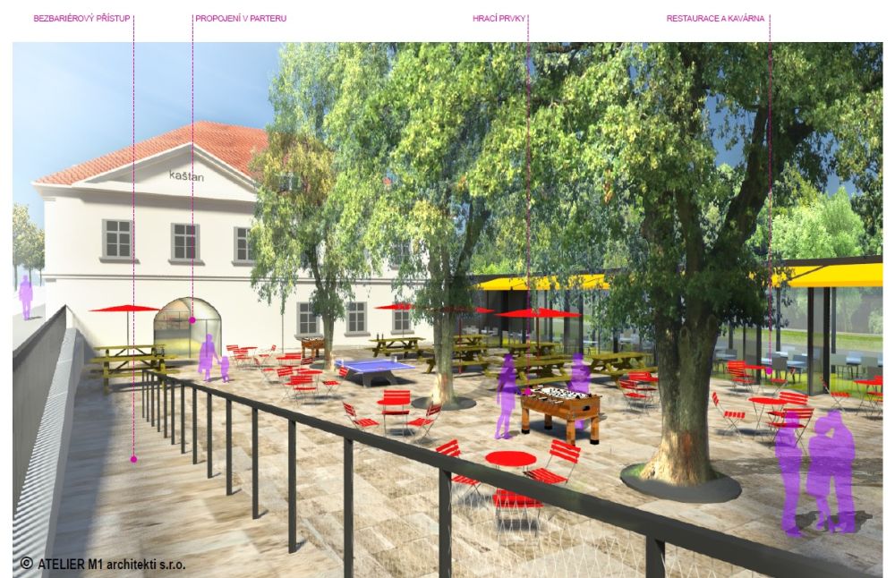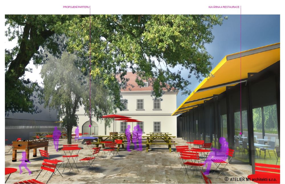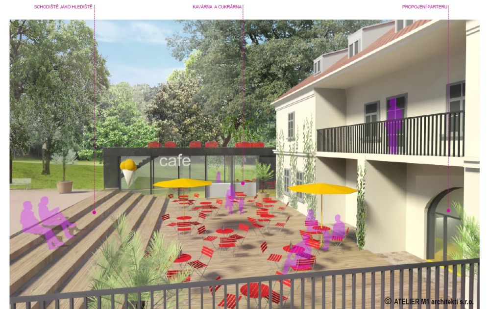 Navrhujeme zlepšení stavu prostředí tak, aby odpovídal významu budovy a využil její potenciál, který jako kulturní centrum bezesporu má. Základním kompozičním prvkem je vložená západovýchodní hmota kavárny a restaurace, která jednak vytváří bariéru proti hluku z Patočkovy ulice a zároveň poskytuje možnost využití prostoru celoročně. Podstatné je propojení budovy s okolím, což je možné rozšířením otvoru v přízemí a použitím transparentních materiálů do průchodu domem.