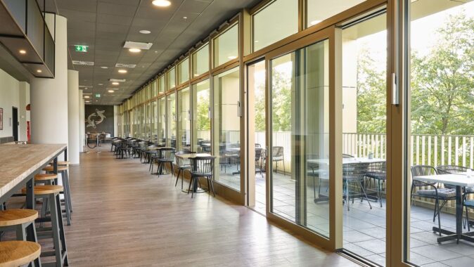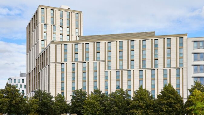 Vzhledem k centrální poloze na dopravní tepně bylo třeba při plánování hotelu zohlednit zvláštní požadavky na zvukovou izolaci, aby hoteloví hosté nebyli rušeni hlasitým vnějším hlukem. Za tímto účelem byly stanoveny požadované vážené hodnoty zvukové izolace po odečtení možných výkyvů komponent. Společnost Wigger Fenster + Fassaden GmbH vsadila při návrhu na okenní systém heroal W 72 , který umožňuje flexibilně splnit různé třídy zvukové izolace od třídy 1 do 5 při stejném vzhledu. Na straně odvrácené od ulice do vnitřního dvora a městského parku byla použita zvukotěsná okna heroal s hodnotou Rw,R 30 dB, zatímco v hlukově exponovanějších částech budovy byla osazena zvukotěsná okna heroal s hodnotami Rw,R 40, 43 nebo 44 dB podle potřeby.