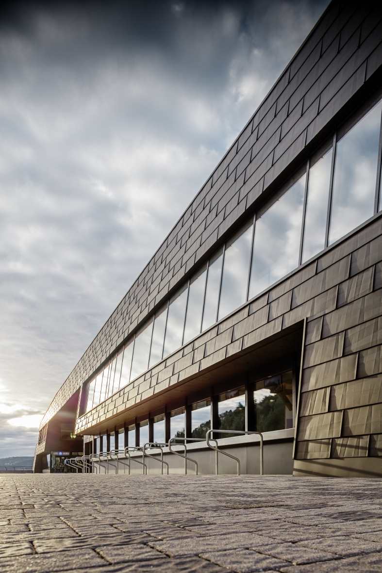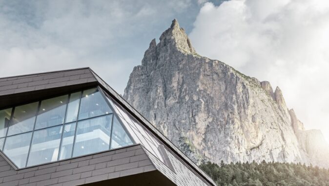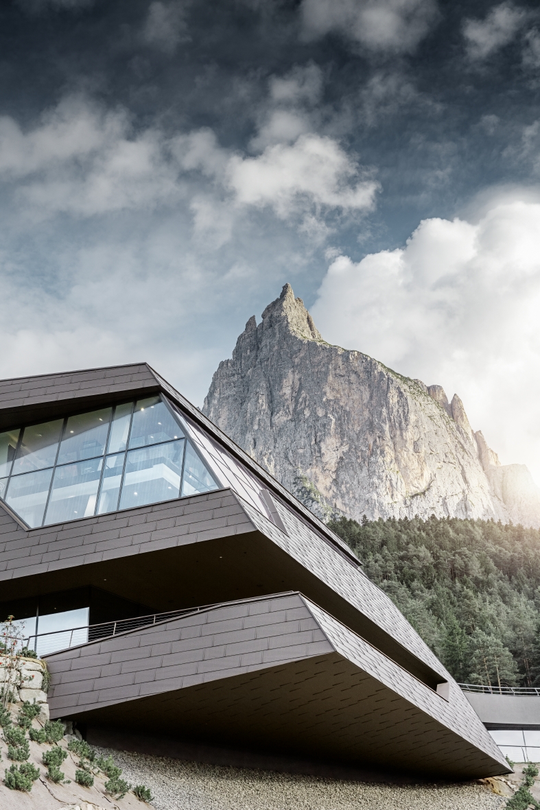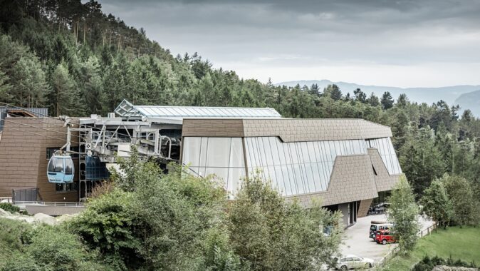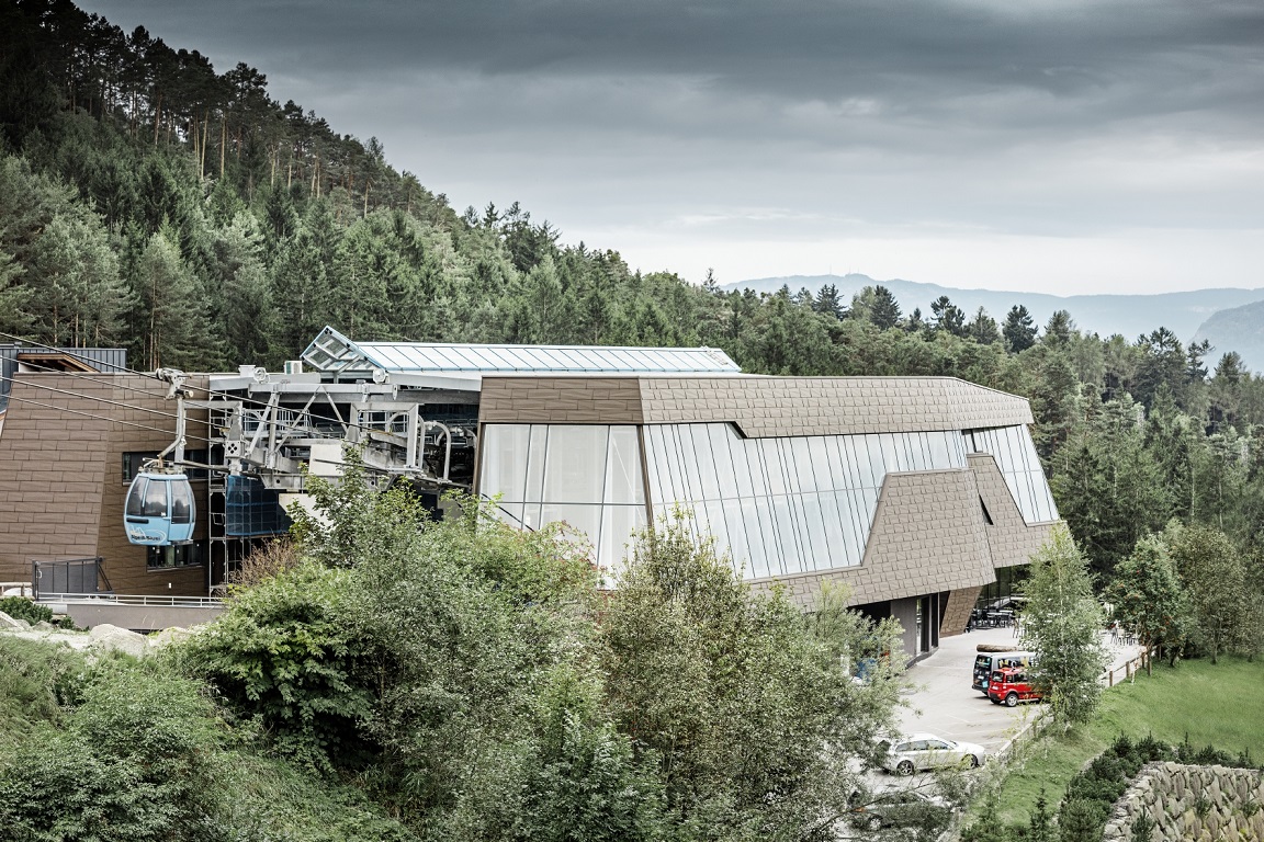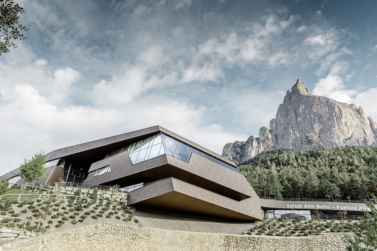 Nově otevřená údolní stanice lanovky v horské vesničce Seis am Schlern je navzdory své efektní velikosti dokonale zakomponována mezi strmé horské masivy a do alpské krajiny zásluhou hliníkové fasády Prefa.