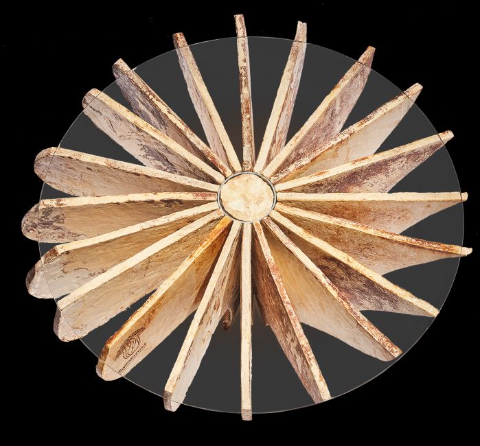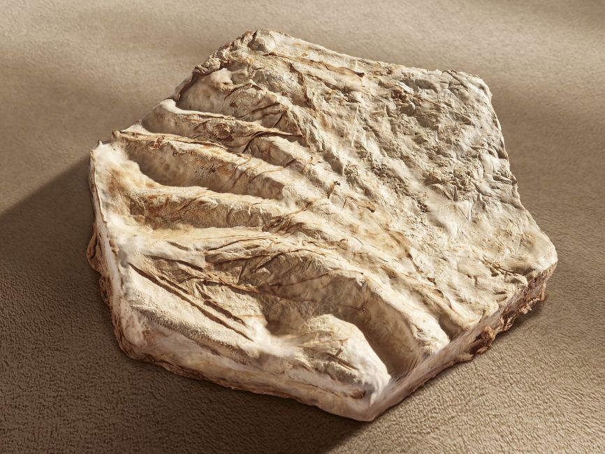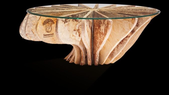 Srdcem výstavy je kavárenský stůl. „Stůl byl vytvořen tak, aby při výrobě nevznikl žádný odpad. Pracovali jsme s panely obdélníkového tvaru, které se vyplnily mykokompozitem. Specifického zakřivení jsme docílili křivkou, která rozdělila panel na dvě části. Jednotlivé křivky se postupně vyvíjí a výsledný stůl se tak plynule prolíná mezi jednotlivými žebry v kontinuální organický tvar,“ vysvětluje designér Tomasz Kloza ze spolku MYMO. Stůl potvrzuje funkci mycelia jako nosné podpůrné struktury. Na výrobu stolu bylo použito 34,5 kg materiálu na bázi mycelia, vyrostl ve formě ze dřeva a PET fólie, je vysoký 400 mm a má průměr 1100 mm.