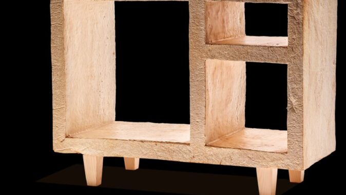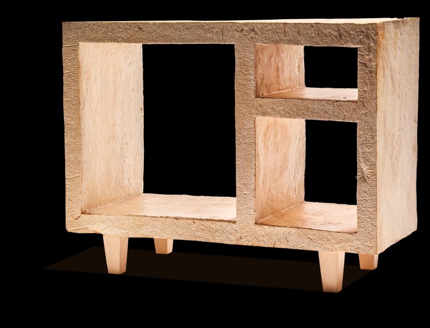 Policová skříň Fí maximálně využívá vlastnosti mykokompozitu (spojení mycelia se svým substrátem) bez použití dodatečných výztuží a nosných prvků. „Na Fí jsme otestovali zajímavý výrobní postup, který ale ve finálním výrobku zůstává skrytý. Jedná se o kotevní body pro připojení nožek. Ty byly navrženy z dřeviny, která je pro houbu přijatelná. Prvky byly volně vloženy do formy a bez jakéhokoli dalšího obrábění se nechaly do skříně zarůst,“ popisuje designér Jakub Kraus, spoluzakladatel studia NAHAKU, který propůjčil výstavě SAMOROSTu svůj cit pro design a netradiční řešení.