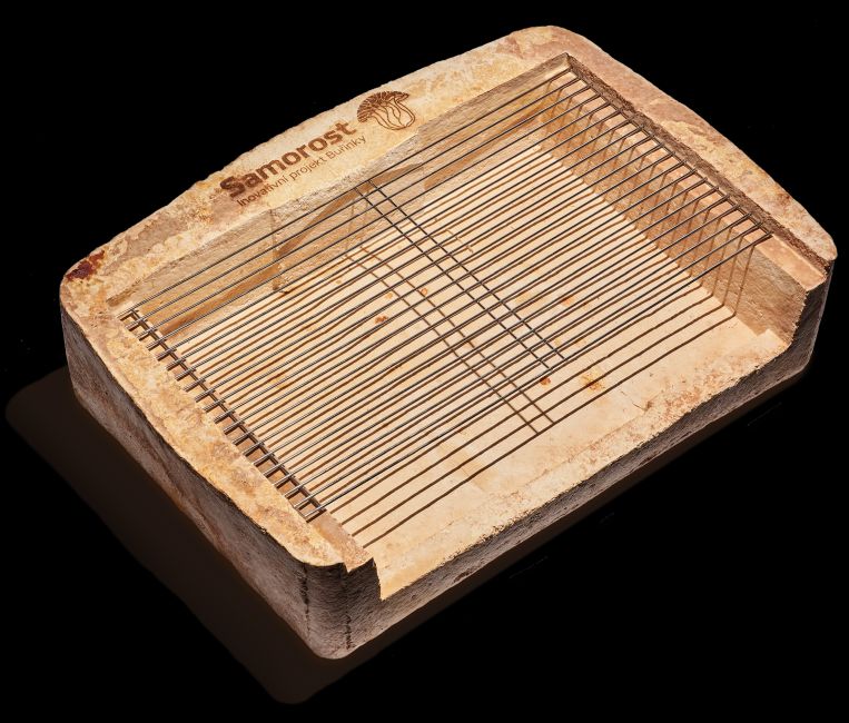 Projekt SAMOROST pracuje s houbou lesklokorkou lesklou. Vlákna neboli hyfy jejího mycelia prorůstají substrátem a vytvářejí husté a pevné sítě. Lesklokorce chutná celulóza, pro svůj růst přijme např. piliny lisované do pelet, běžný papír či karton. Vhodný je ale také papír ze sádrokartonu, který už nelze recyklovat a pro nějž už neexistuje žádné další využití. Propojením mycelia a substrátu vzniká pevný materiál, tzv. mykokompozit. Má jednu zásadní vlastnost. Je-li rozdrcen a vložen do formy, jeho hyfy se na sebe opět napojí, začnou růst a vytvářet ještě pevnější mykokompozit. Tentokrát však ve tvaru, který mu určí forma. Po vysušení přestává být podhoubí živé, a vzniká materiál unikátních vlastností, připravený na další opracování.