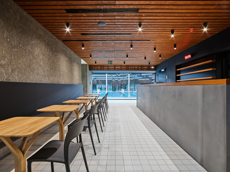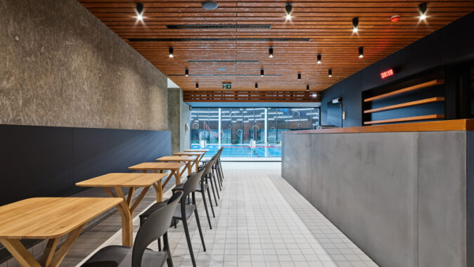 Interiéru dominují teplé přírodní odstíny. Obklad stěn tvoří modřínové dřevo a podlahu pokrývá keramická dlažba v odstínu slonové kosti. V místech většího provozního zatížení nebo tam, kde je povrch vystavený stříkající vodě, autoři použili černou vysokotlakou laminátovou desku. Interiér je doplněn pohledovým betonem s obtištěnou OSB deskou, která pomáhá zakrýt nedokonalosti při vytváření pohledové monolitické konstrukce. Příjemné relaxační prostředí ve wellness části vytváří dřevěný obklad zvlněný v organických křivkách.