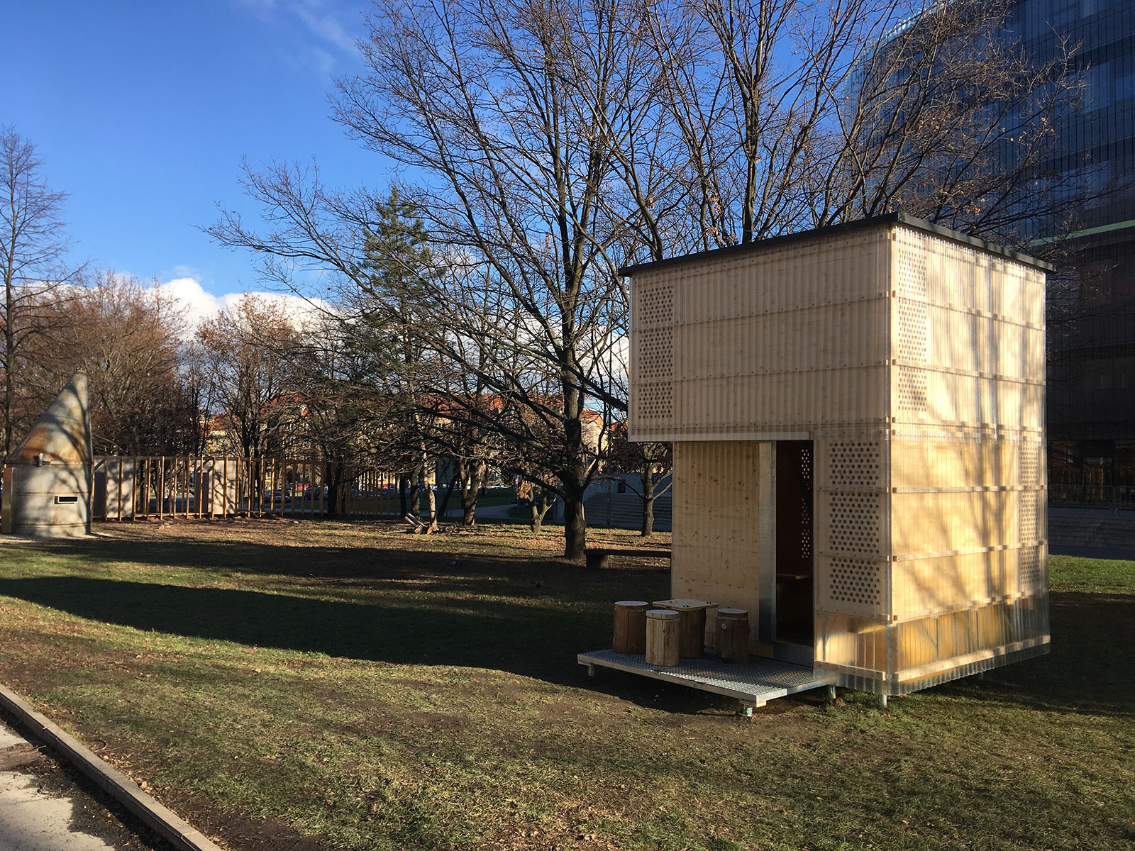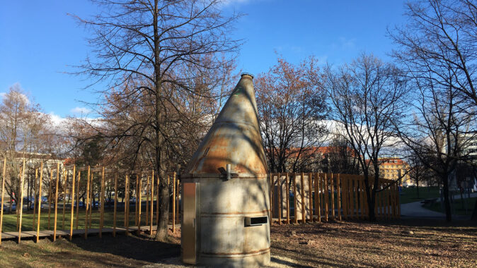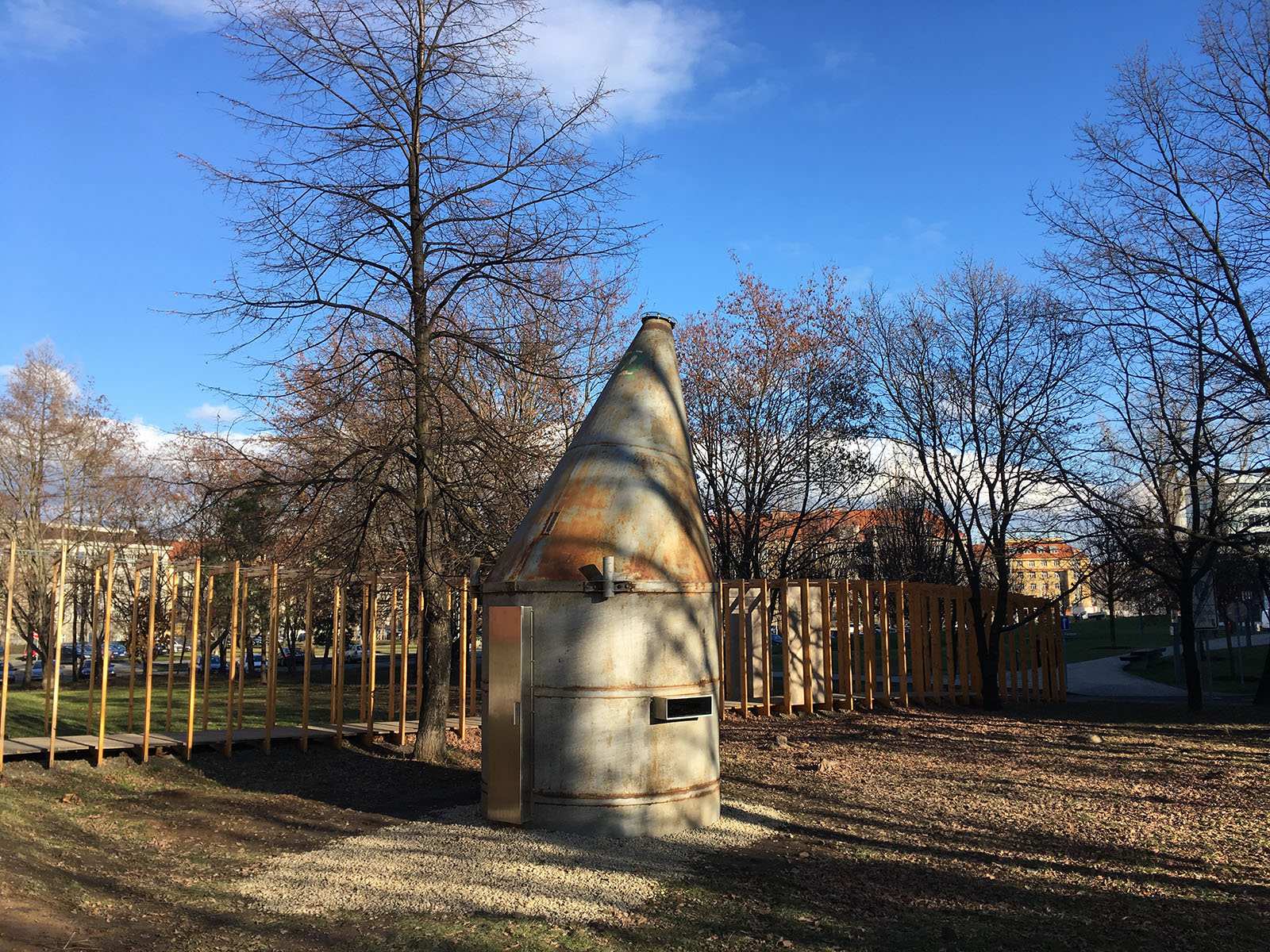 budka je vyrobena z kovu a její kruhový půdorys kopíruje kruhová lavice.