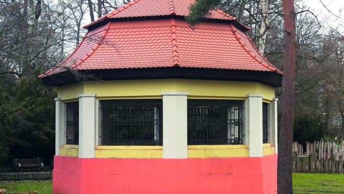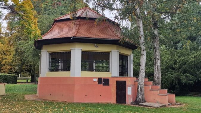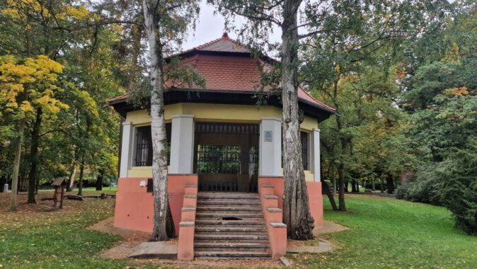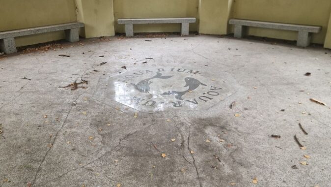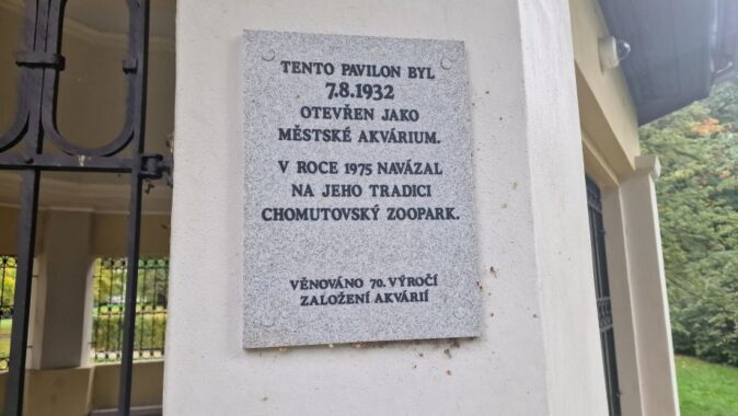 Pozornost poutá díky neobvyklému historickému nápisu „Akvárium“, umístěnému uvnitř na dlažbě. V roce 1932 v něm totiž vzniklo městské akvárium, kde bylo k vidění takřka sto druhů ryb, obojživelníků a plazů. Pamětníci si nevšední zážitky z chomutovského parku s úsměvem vybavují dodnes.