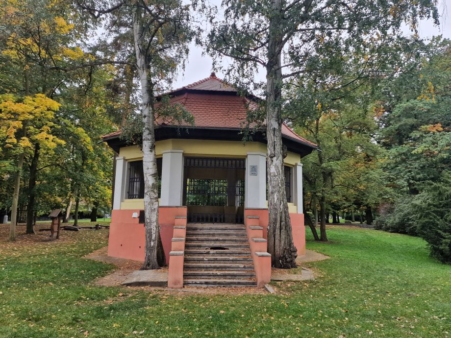 Nenápadný zděný altán je dokladem, že nejstarší chomutovský park reprezentoval v meziválečném období nejen oázu klidu, ale také centrum zábavy a pohybového i kulturního vyžití.  Nechybělo v něm divadlo, ani hudební pavilón. Romantická zákoutí pro rozjímání skýtalo rozárium s dřevěným altánkem, které založil známý šlechtitel růží Vincenz Berger. Tento chomutovský rodák je zároveň autorem další velké chlouby Městských sadů – květinových hodin.