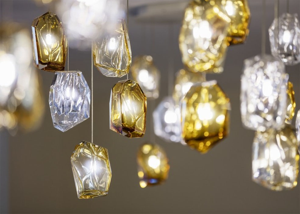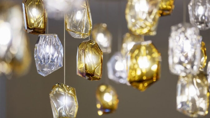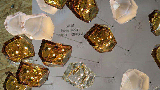 48 ručně vyráběných svítidel krystalického tvaru ve třech odstínech,