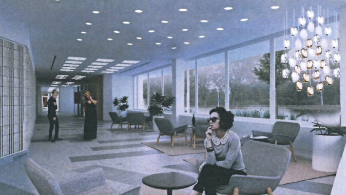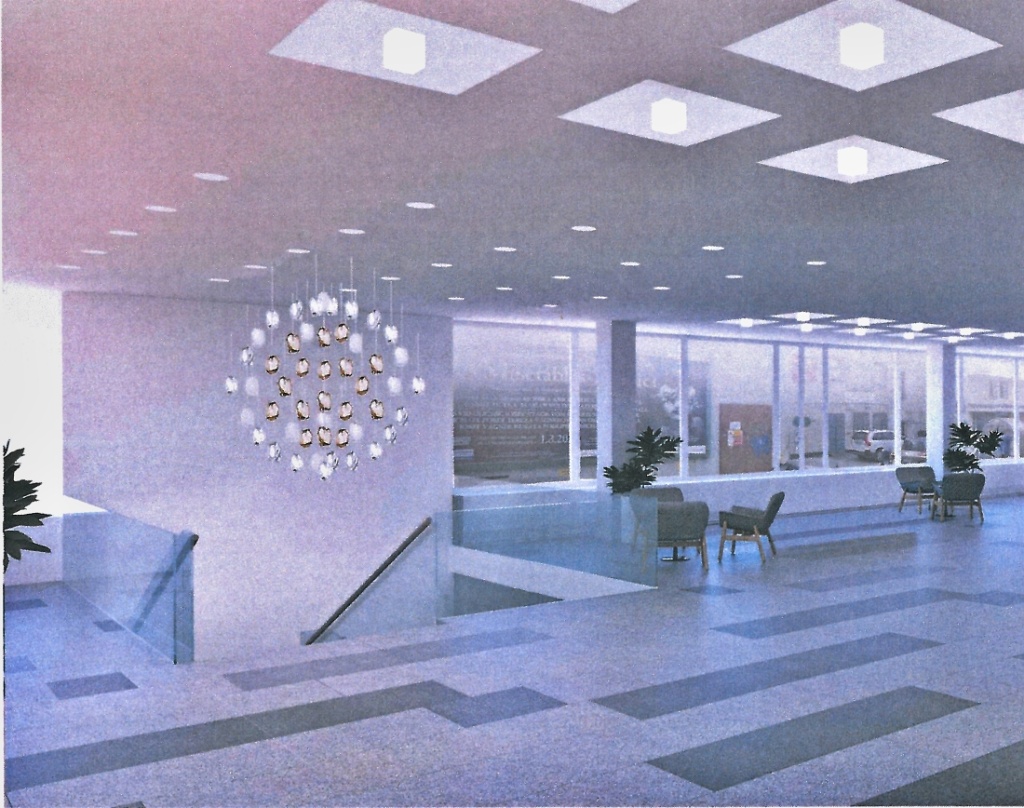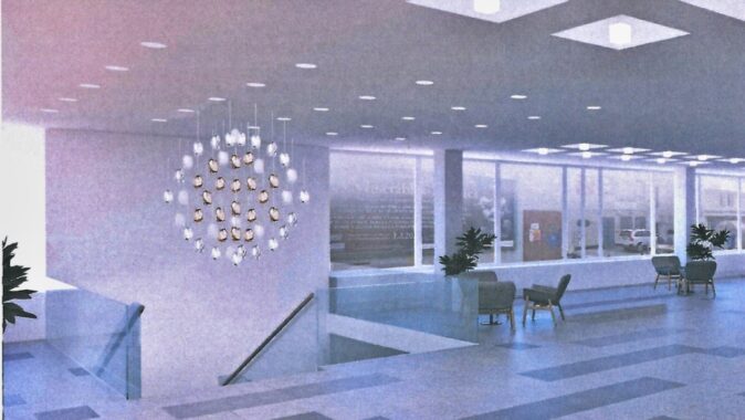 Osmaosmdesát kusů precizně broušených skleněných kamenů ve dvou světelných instalacích pro budovu zpracovala česká sklářská a designérská společnost Lasvit. Svítidla jsou sestavené ze zářících krystalů vyrobených podle návrhu izraelského designéra Arika Levyho. Architekt Ondřej Tuček jeden umělecký lustr umístil do ohybu