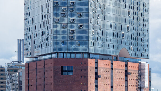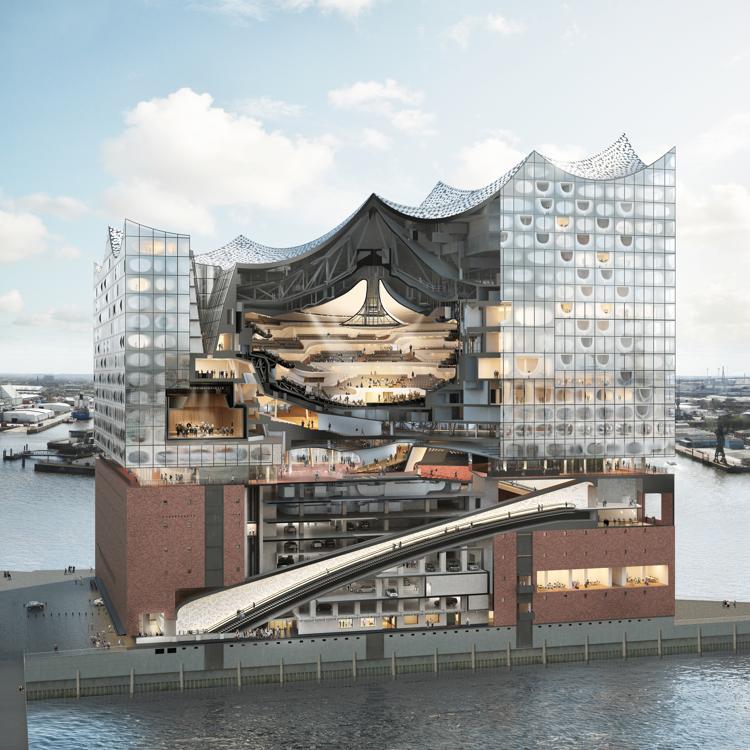 budova Labské filharmonie v Hamburku. Stavba, jejíž střecha připomíná