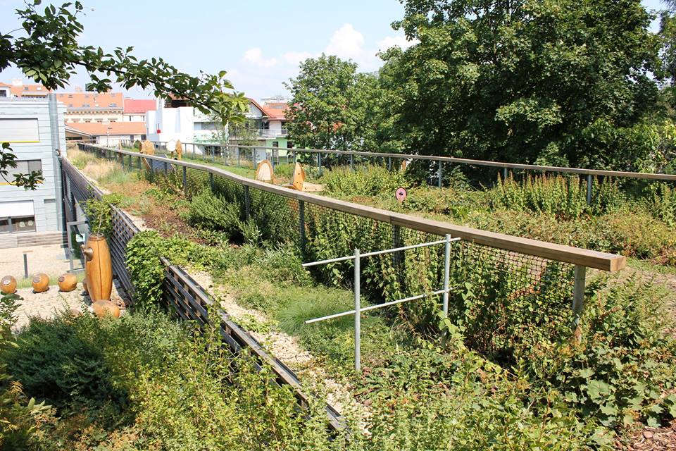 vliv mají stromy a zelená střecha vzdělávacího centra na městské mikroklima.