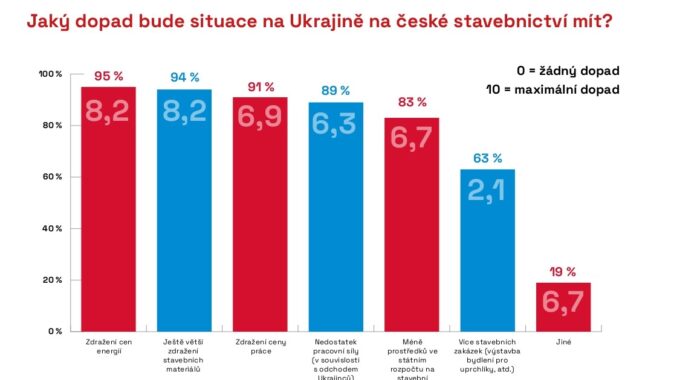 Otázkou je, jaké dopady může situace na Ukrajině na české stavebnictví mít. Stavební společnosti hodnotily možné dopady na škále 0–10, kde 0 = žádný dopad na danou oblast a 10 = maximální dopad na danou oblast. Většina dotázaných se vyjádřila, že tato situace povede ke zdražení energií (95 %), což v současné chvíli již všichni pociťujeme. Tento dopad ohodnotily stavební společnosti 8,2 body z 10 možných. Dále se 94 % domnívá, že bude docházet k dalšímu zdražování stavebních materiálů, a to především těch, u kterých je Ukrajina významným exportérem. Zde hodnotily stavební společnosti dopad 8,2 body. Stavební společnosti také ohodnotily 6,9 body zdražení cen práce. Pro tento bod se vyjádřilo 91 % dotázaných společností. Stavební společnosti naopak neočekávají, že by docházelo k vypsání většího objemu stavebních zakázek na výstavbu v souvislosti s ubytováním uprchlíků (2,1 bodu z 10 možných). Pětina dotázaných se také domnívá, že mohou nastat jiné dopady, jako je například nižší objem vypsaných zakázek či celková ekonomická krize.