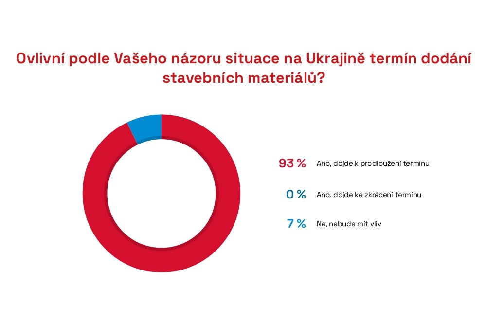 Okolnost, která stavebnictví trápí již od počátku pandemie, je prodlužování termínu dodávek stavebních materiálů. Vzhledem k tomu, že mnohé klíčové stavební materiály, jako například železo, pochází z velké části z Ukrajiny, je logické, že dojde na trhu k prohloubení nedostatku materiálu. S tímto tvrzením souhlasí na 93 % dotázaných stavebních společností.
