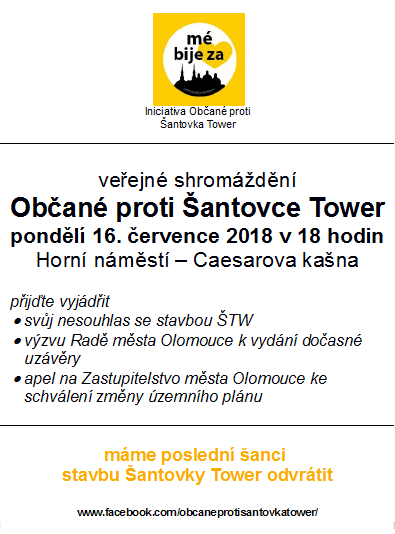 (ČTK – 16.7.2018) – Několik desítek lidí v centru Olomouce protestovalo proti záměru firmy SMC Development postavit nedaleko městské památkové rezervace výškovou budovu Šantovka Tower. Organizátoři veřejného shromáždění tvrdí, že developer už získal důležité povolení a může pokračovat v přípravě stavby 75 metrů vysoké budovy, která by podle nich poškodila historické panorama města. Proti projektu Šantovka Tower se v Olomouci naposledy protestovalo na podzim 2013, kdy do ulic vyšly stovky lidí.