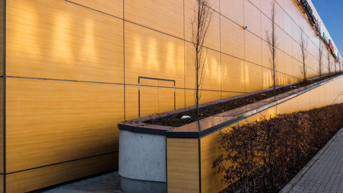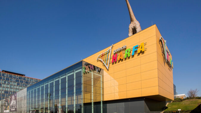 Na fasádě Galerie Harfa v Praze-Vysočanech byl použit dekor dřeva, projekt byl