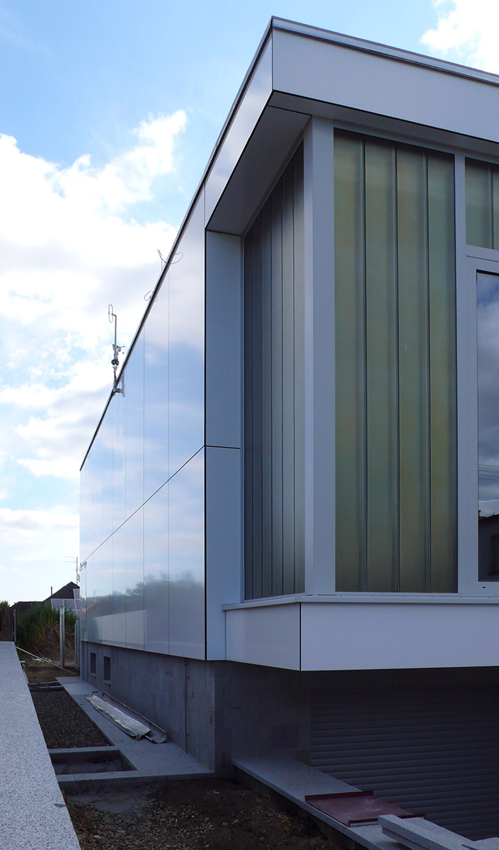 fasáda je mechanicky ukotvena na hliníkový nosný rošt vyplněný izolací, která
