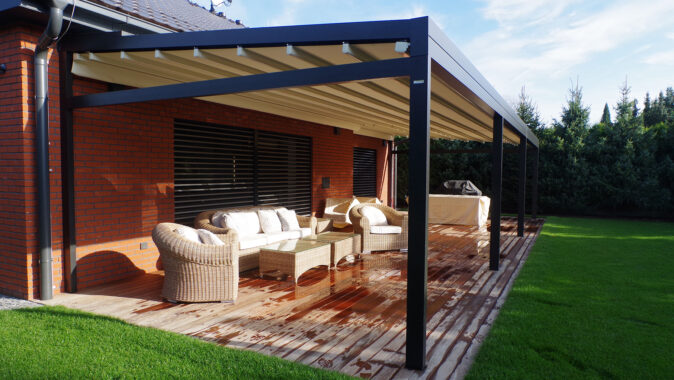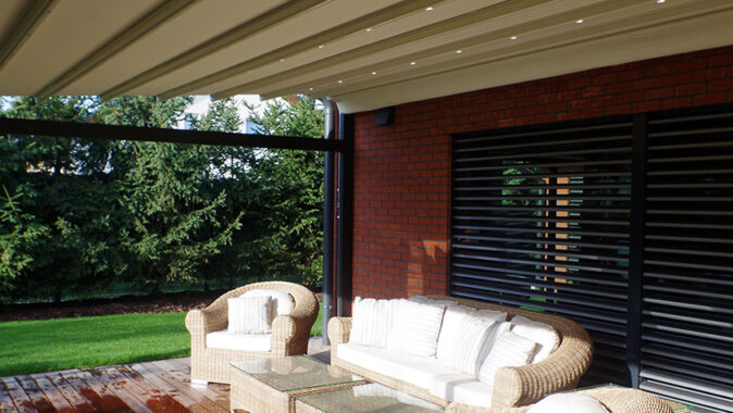 Stínicí systém dvou hliníkových pergol dodává potřebný stín majitelům nového rodinného domu. Stínění zakrývá dvanáct metrů dlouhou a pět metrů širokou terasu, kterou chrání před sluncem a díky voděodolné látce také před deštěm.