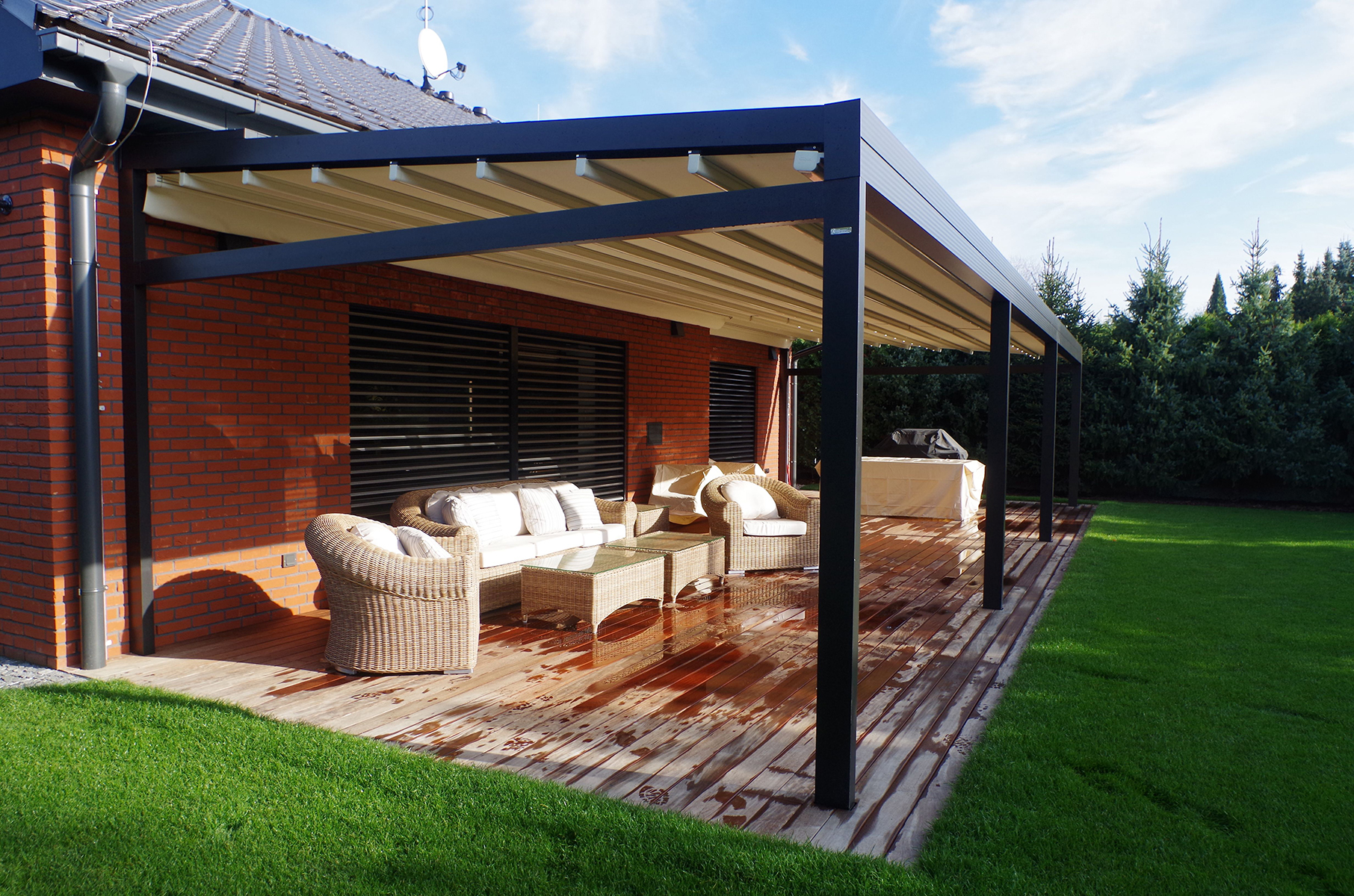 Autoři projektu, ateliér di5 architekti inženýři, již ve fázi projektu úzce spolupracovali jak s výrobcem, tak i s prováděcí firmou. Po zvážení všech výhod dali namísto obyčejné pergoly majitelé přednost na míru vyrobené hliníkové pergole MED QUADRA R od tradičního českého výrobce Climax. Její konstrukce se vyznačuje čistými pravoúhlými tvary. Špičkové hliníkové profily nosné konstrukce jsou opatřeny vypalovaným lakem, a tudíž zcela bezúdržbové. Pergola je vhodná i do deště. V předním horizontálním profilu je zabudován žlab, kterým voda odtéká přes stojky dolů. Posuvná látka je voděodolná. Dálkově ovládané LED osvětlení, umístěné přímo uvnitř profilů, navodí správnou atmosféru i ve večerních hodinách.