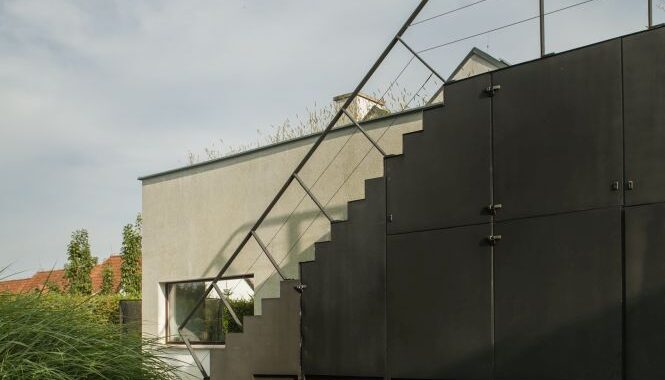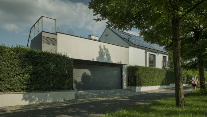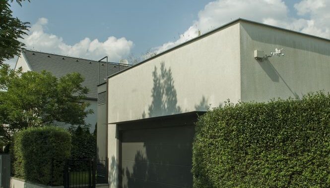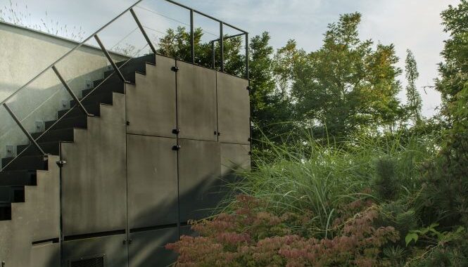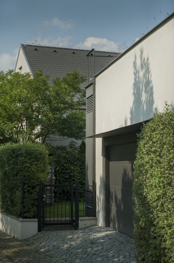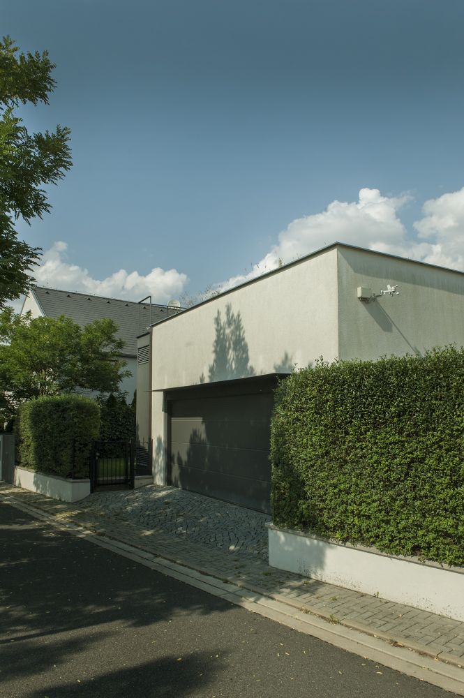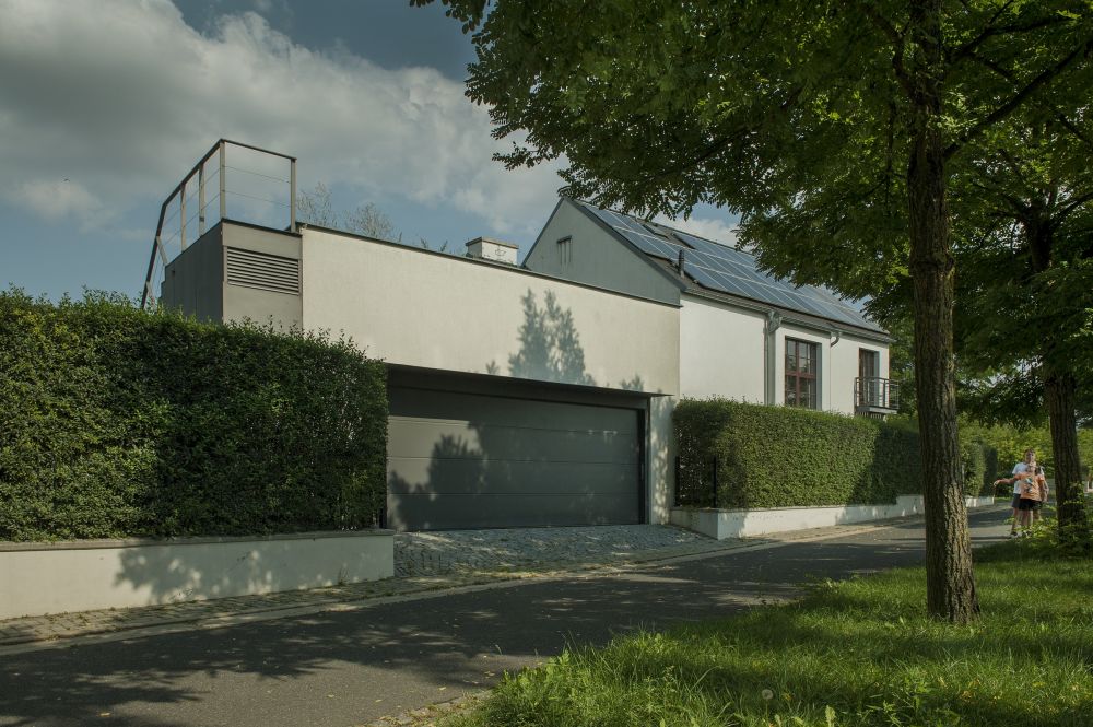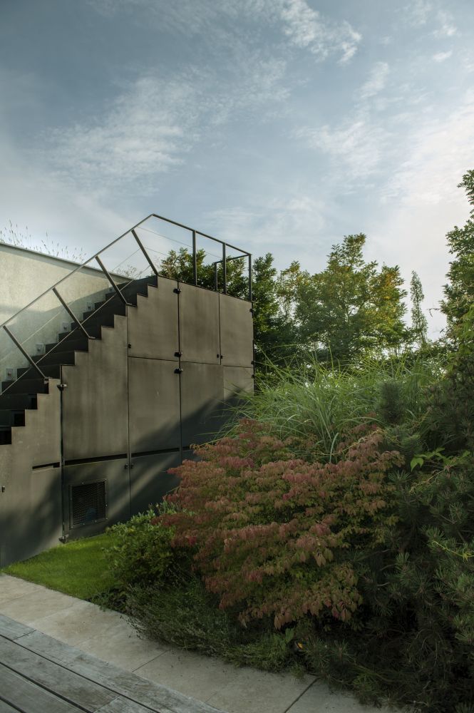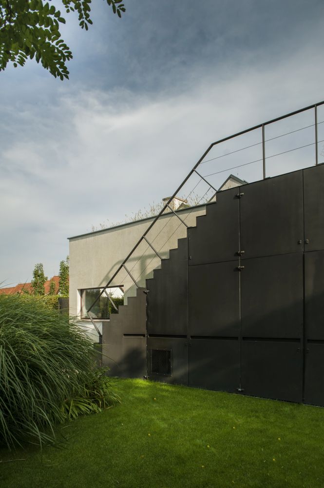 Zahrada byla na začátku jen holá travnatá plocha. Na plnohodnotné žití venku to nebylo. A proto jsme postupně doplnili venkovní zastřešenou kuchyni, na ni navazující terasu a bazén, dále různá krytější zákoutí, sezení, relaxační kouty, místa na grilování a podobně. Na hraní fotbálku a trampolínu samozřejmě také prostor zbyl. Kuchyně s krytým sezením je transformovaná zmenšením garáže. K ní je přistavěná veliká „skříň“, do níž je ukrytá bazénová technologie a místa na skladování. Je po ní možné vystoupat jako po schodech na plochou střechu s užitkovou a bylinkovou zahrádkou.