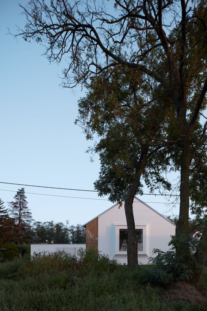 Pozemek se nachází na kraji obce, kde už klasickou vesnickou strukturu ukončuje vila městského charakteru. Dům tedy stojí na hraně původního a nového urbanismu. Pozemek je úzký a svažitý. Logicky jsme sem umístili protáhlou hmotu, dle požadavku investorů jednopodlažní. Měřítkem domu a poměrem jeho délky k šířce se přibližujeme původním domům. Vracíme stavební čáru k ulici a dům situujeme co nejvíce na hranu pozemku se sousedem, jak nám to jen normy a vzájemné vztahy umožňují. Nejraději bychom stavěli na hranici parcely. Dům se postupně zapouští do terénu, aby zbytečně netrčel. Nechtěli jsme výrazně měnit přirozenou topografii pozemku.