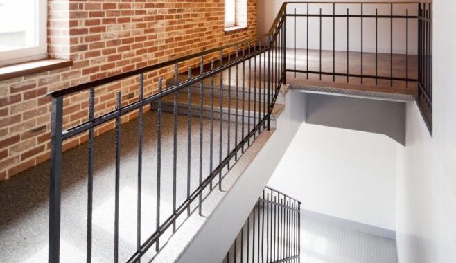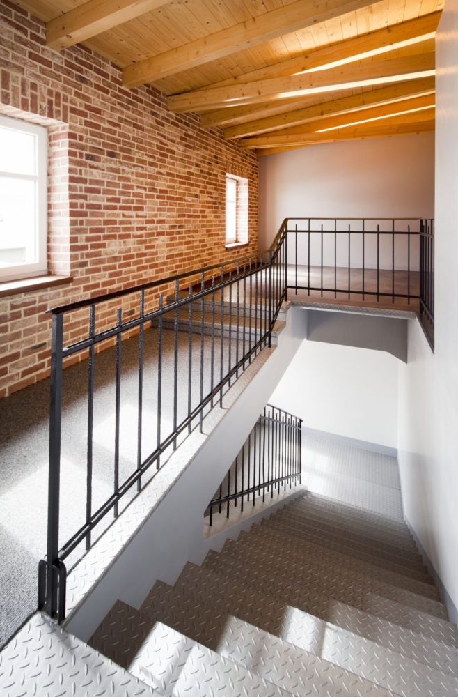 v betonové šedé, přístupové schodiště s povrchem ze slzičkových plechů, vstupní