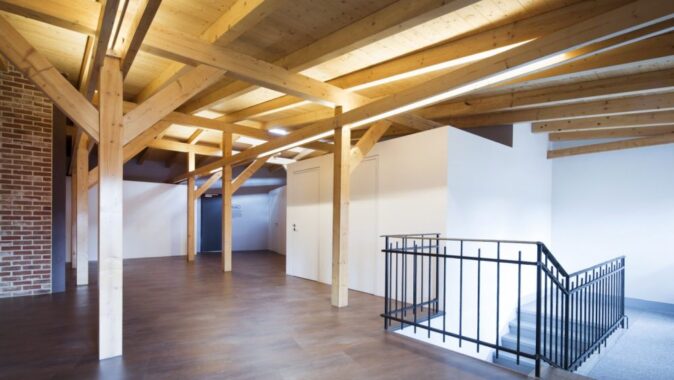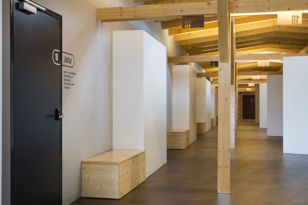opírá o vestavbu kontrastních boxů do existujících prostor skladu v podkroví