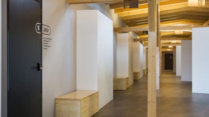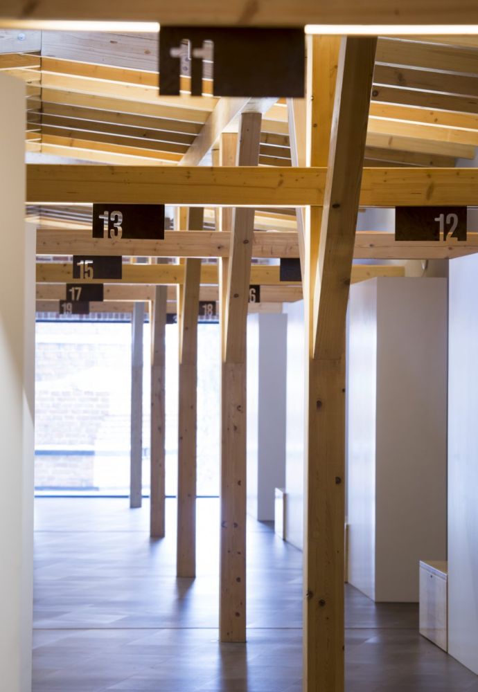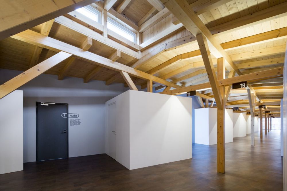Vložené boxy nově organizují podkrovní prostory, definují společná prostranství a hotelové pokoje. Respektují stavební strukturu objektu, vstupují do dialogu s dřevěnou konstrukcí krovu a se střešními světlíky. V bílé barvě plují po rezavé podlaze. Stávající sloupy krovu jsme ponechali jako jakési sochy-objekty. Umístěny jsou ve společném prostoru a vedle stěn v pokojích, stojí samostatně v interiéru některých koupelen. Společnému střednímu komunikačnímu prostoru dominuje oknem zarámovaný výhled na tovární komín a ocelové schodiště.