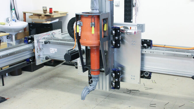 Tisk na staveništi až do vzdálenosti 5,6 metru a výšky 3,2 metru bude zajišťovat otočné a posuvné robotické rameno. Zatím naši vědci vyvinuli model tohoto ramene v měřítku 1:4 a na něm si už ověřili, že rameno dokáže opsat jakoukoliv křivku. „Architekti požadují, aby bylo možné tisknout stěny s prakticky libovolnou půdorysnou křivostí, která se může velmi rychle měnit. Včetně přerušování tisku a vzniku ostrých zlomů,“ upřesňuje Václav Záda z FM, jeden z hlavních autorů tiskového robota.
