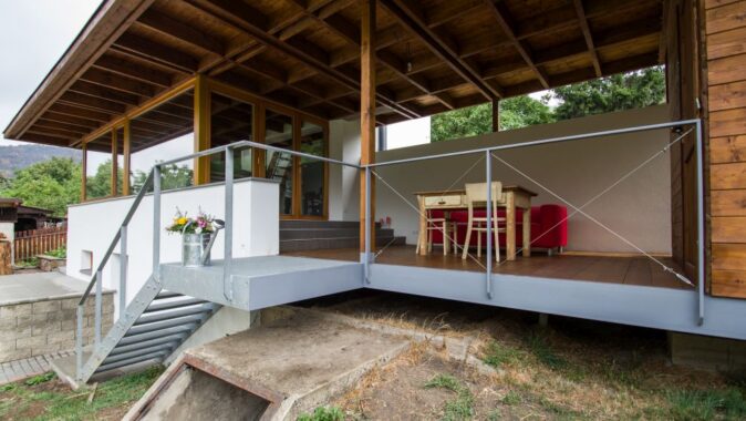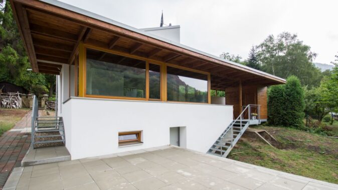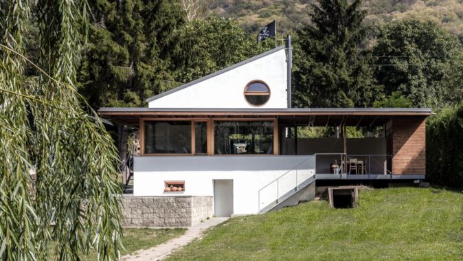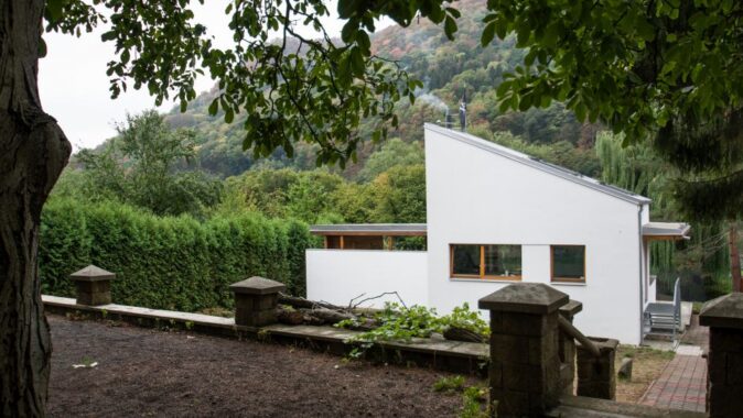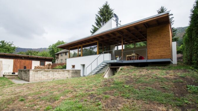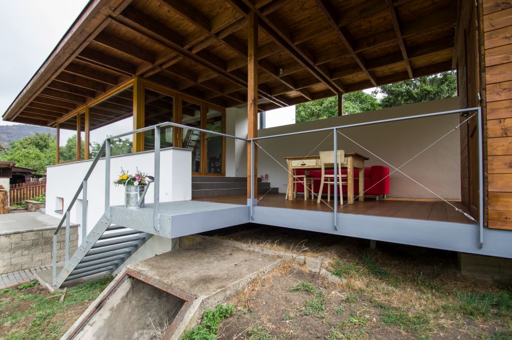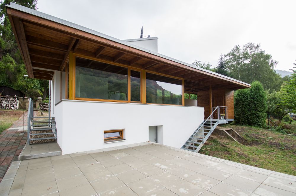Přáním investora bylo navrhnout na půdorysu stávající chaty nový dům, který umožní rekreaci rodiny od jara do podzimu. Na základě rozboru řešeného území byla nad stávajícím vyvýšeným suterénem vystavěna nová konstrukce chaty. Velkými okny je propojena s krajinou okolo řeky a naopak masivní zděnou stěnou odcloněna od hluku železnice. Celý objekt sjednocuje dřevěná lehká střecha nad přízemní částí s velkými přesahy nad venkovními schodišti a okny. Střecha přechází i nad terasu a svou konstrukcí tak propojuje interiér s exteriérem.