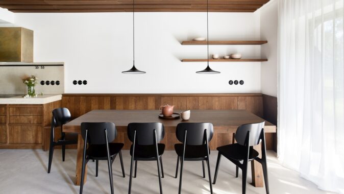 vetknuto mezi krb a stěny. Naproti němu je umístěn jídelní stůl s lavicí, která
