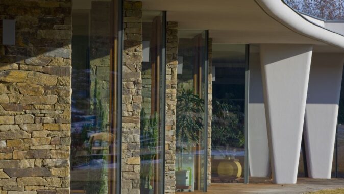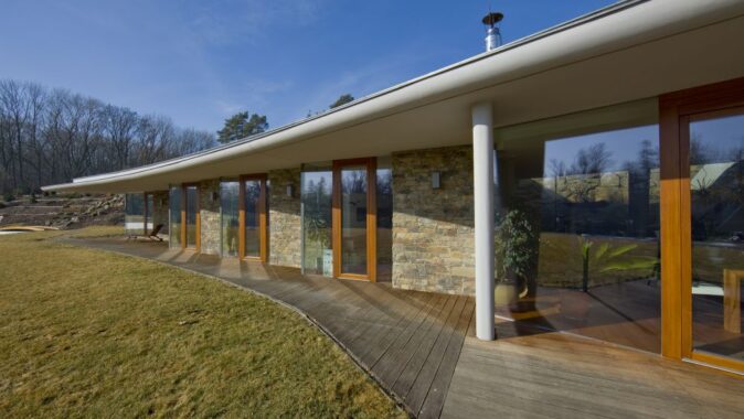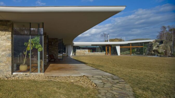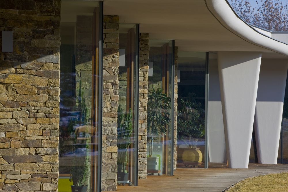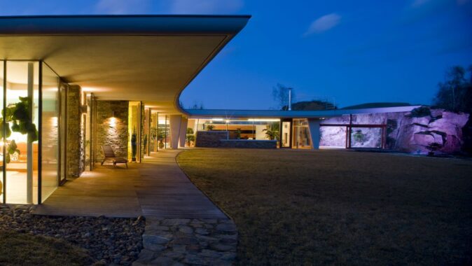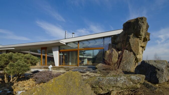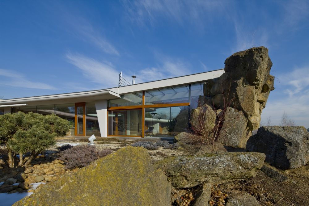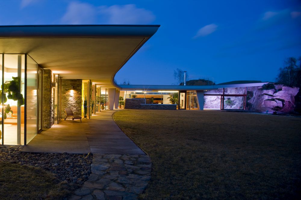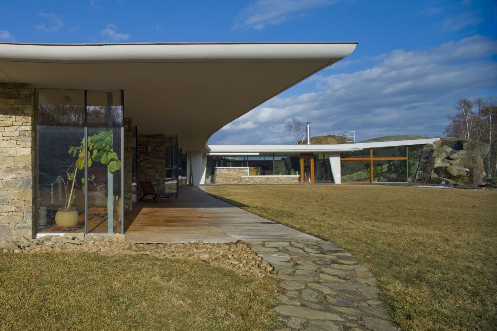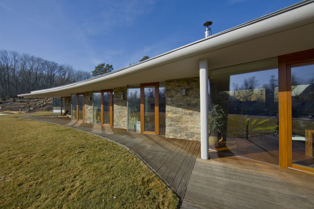 Dům pro náročného klienta: jeho koncept vyplynul z výrazné konfigurace pozemku. Hlavní křídlo je zády „vnořeno“ do svahu, hlavní obytný prostor rozvinut v křídle kolmém, takže propojuje svah a přilehlou skálu. Tím ji získává pro interiér. Aby se dostalo dost denního světla do jídelny a jako kompoziční protiváha skály je na styku obou křídel umístěn „trychtýř“ konického atria. Zelená střecha navazuje na terén, rozsáhlé plochy bezrámového prosklení hladce pouští dovnitř okolní zeleň.