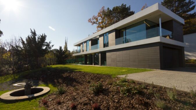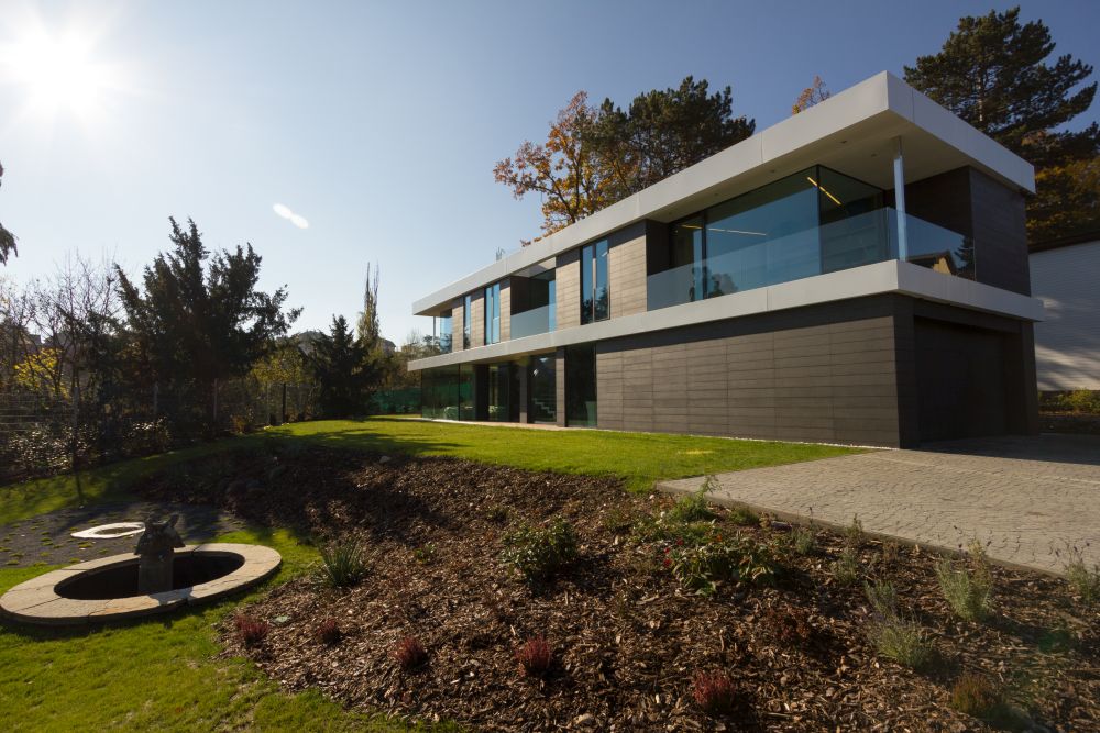 Dům stojí na svažitém pozemku, kde byl původně ovocný sad se