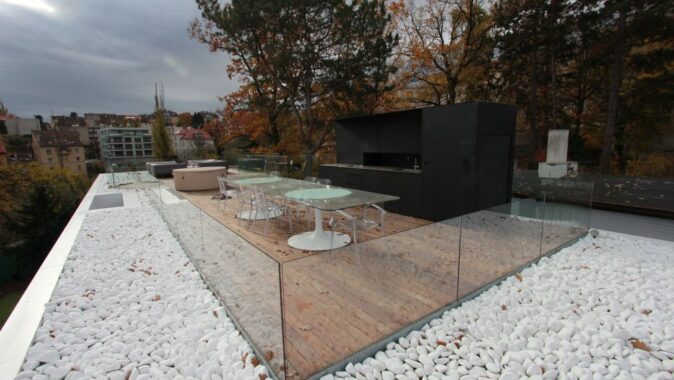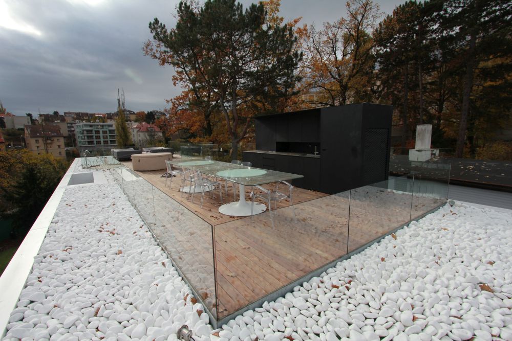 Povrchy a detaily z ušlechtilých materiálů se téměř vždy zpracovaly v dílnách. Střecha tvoří další využitelnou část domu – vymezena je skleněným, většinou pouze devadesát centimetrů vysokým zábradlím. Je tu velká kuchyň, dlouhý stůl (4,6 m) se skleněnou deskou z jednoho kusu, na míru byla zhotovená i sedací souprava. Nechybí ani sprcha a vířivka.