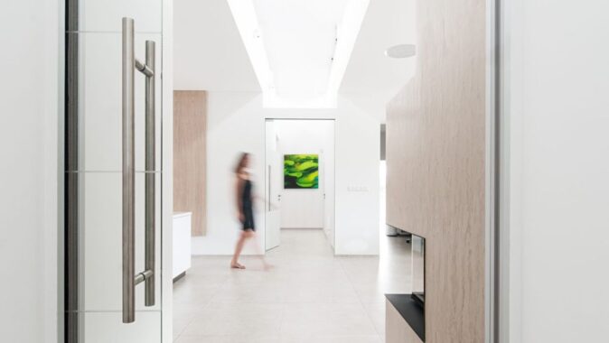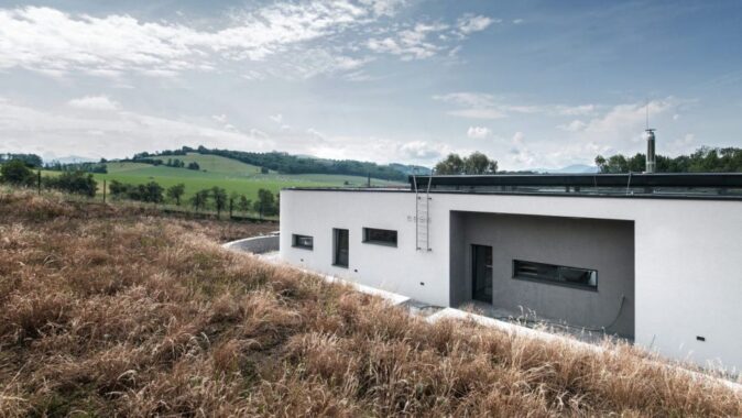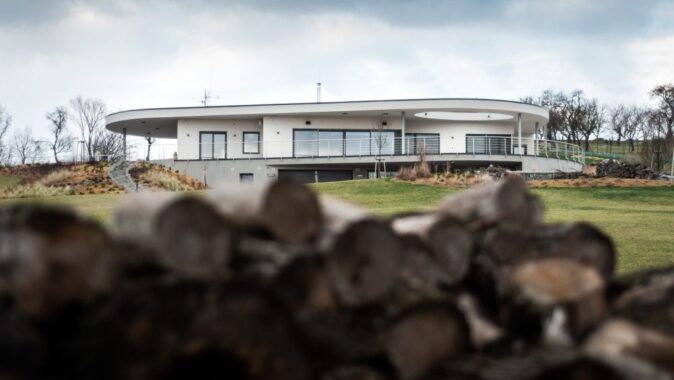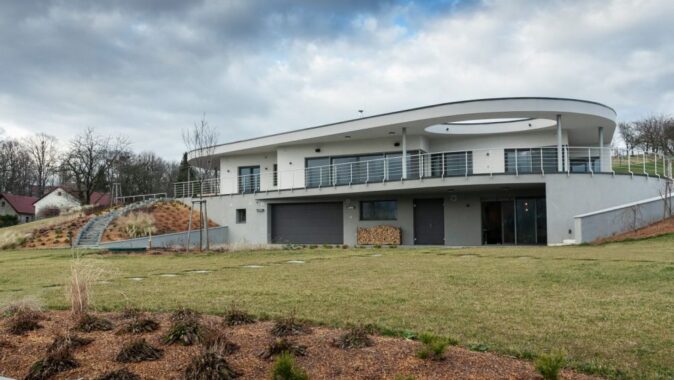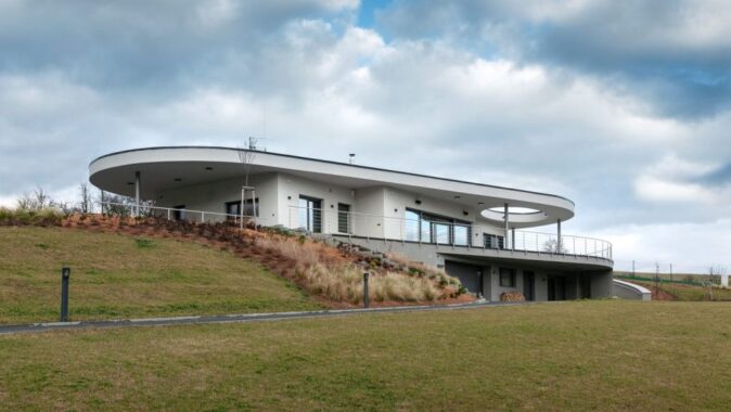 Zahradou se přijíždí k horní hranici pozemku, do garáže v 1. PP nebo ke vchodu. Z jedné strany odkryté 1. PP obsahuje technické zázemí domu, garáž a spa. Obytné podlaží nabízí výhledy do krajiny na velkorysé terase.