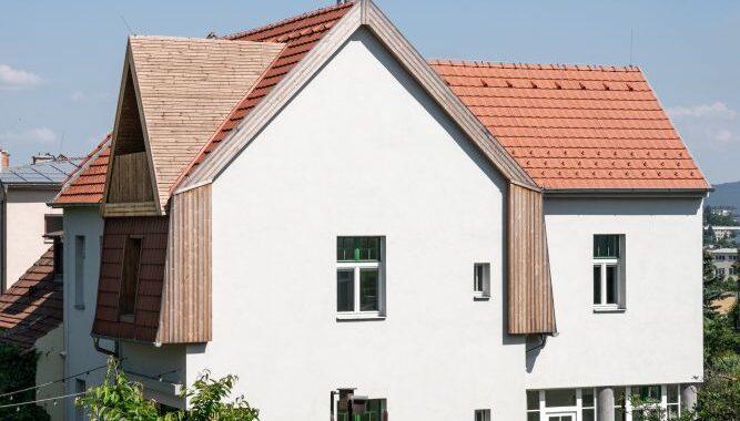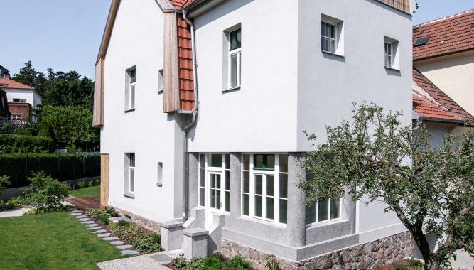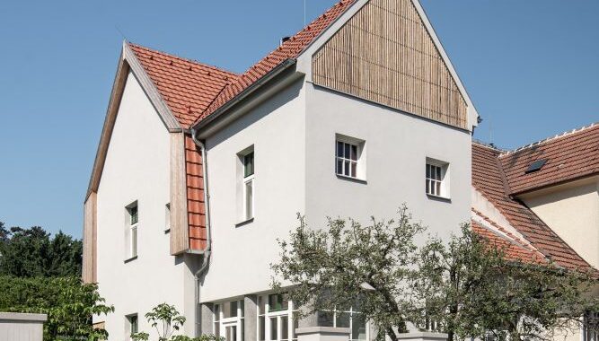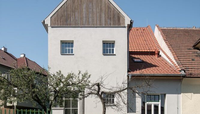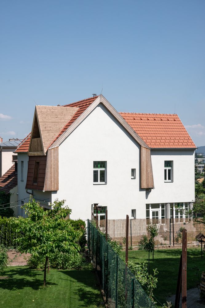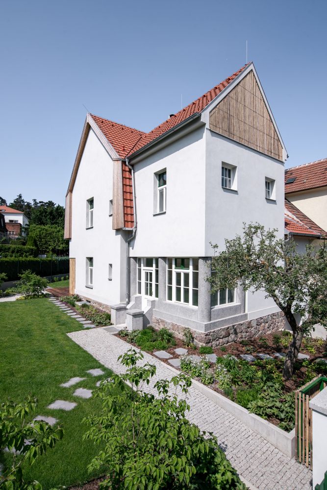 Jedná se o realizaci šitou na míru s mnoha atypickými detaily i stavebními principy, celý projekt provází motiv trojúhelníku. Nové části domu definují plochy tvořené bambusovými či modřínovými prvky, důraz jsme kladli na netradiční dispoziční uspořádání. Úpravy v 1. NP spočívaly v přemístění vstupu na verandě, probourání hlavních nosných zdí a propojení místností. Vznikl velkorysý a vzdušný prostor s kuchyní, jídelním koutem a obývacím pokojem, v jehož centru je umístěn krb, srdce domu. Dominantním prvkem je tu také dřevěný jídelní stůl s trojúhelníkovou inkrustací, jehož okolí tvoří vzdušný bílý nábytek. Propojení se zahradou zajišťuje velkoplošné rohové prosklení zčásti kryté bambusovým slunolamem. Dřevěné domovní schodiště bylo odstraněno a nahrazeno novým, z ocelové konstrukce obložené dřevem. Vede z hlavního vstupu do chodby ve 2. NP, odkud je přístup do dětských pokojů, hostinského pokoje, do koupelny a na toaletu. V chodbě je i další dřevěné schodiště do obytného podkroví.