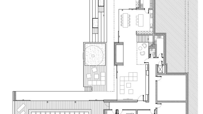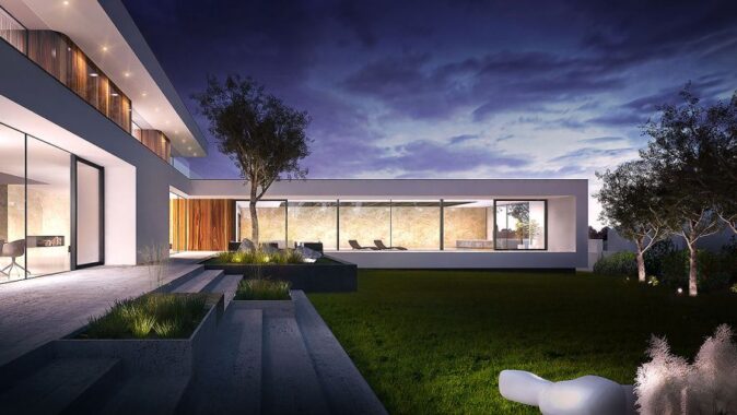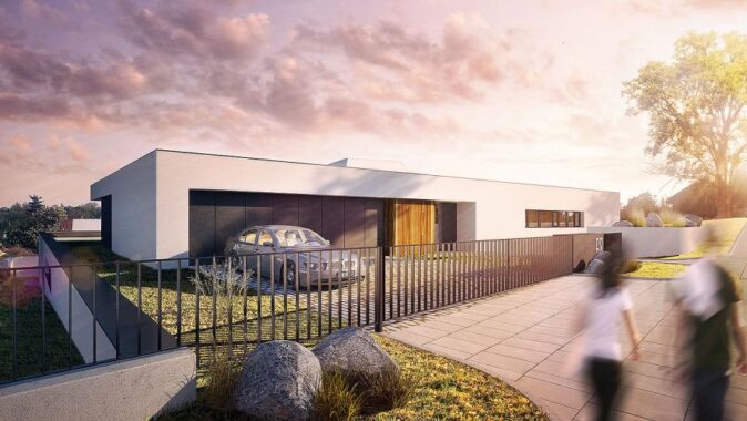 Hlavní vstup a vjezd do garáže pro 3-4 auta se nachází v 1. NP ve výškové úrovni ulice. Na zádveří navazuje schodišťová hala, která prochází přes dvě podlaží do obývacího pokoje. Luxus spojený s užíváním domu poskytuje osobní výtah. Nadzemní patro patří klidové části domu. Ložnice rodičů každá se samostatnou šatnou a dva dětské pokoje rovněž se samostatnými šatnami mají přístup na terasu s výhledem do zahrady a na panorama Brna. Pokoj pro hosty je řešený s možností vlastního vstupu z ulice. Je vybaven také vlastní koupelnou a kuchyňskou linkou. Zbývající prostory vyplňují prádelna, pracovna a šatna.