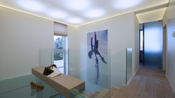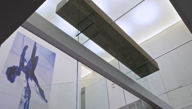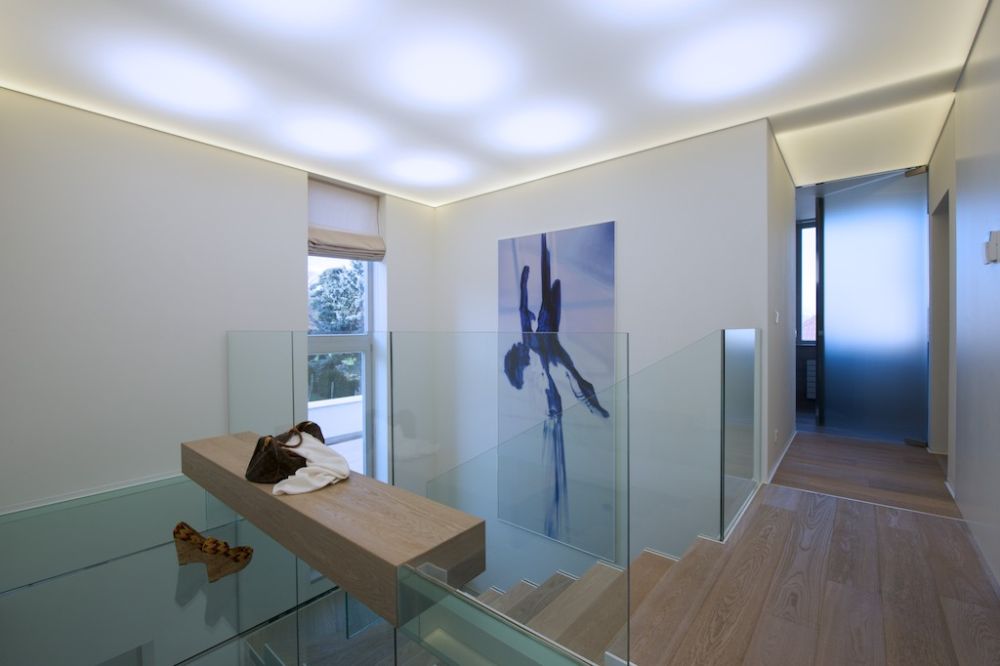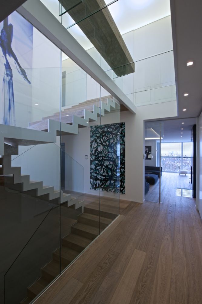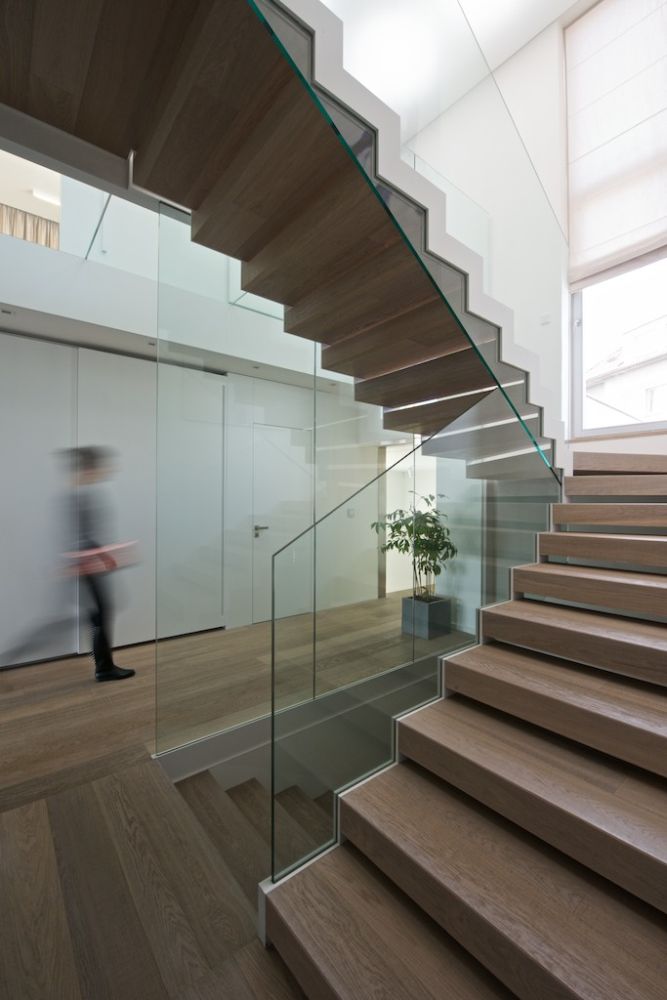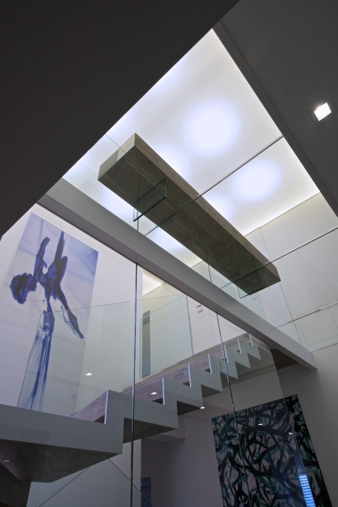 V interiéru se kladl důraz na souhru přirozeného osvětlení okny, nepřímého LED osvětlení, rozptýleného světla barrisollovými podhledy a to vše v kombinaci levitujícího nábytku tak, aby byla umocněna vzdušnost prostoru. Použité materiály jsou dřevěnná podlaha z běleného kartáčovaného dubu, bílý lakovaný nábytek, lakované béžové a antracitové sklo. Nedílnou součástí interiéru jsou fotografie Jiřího Machta.