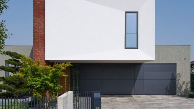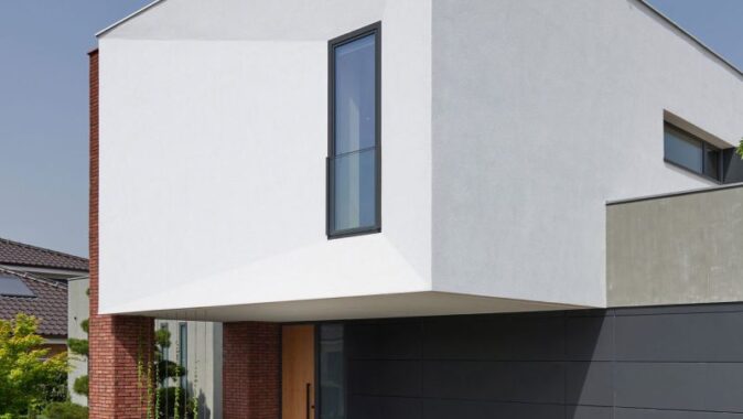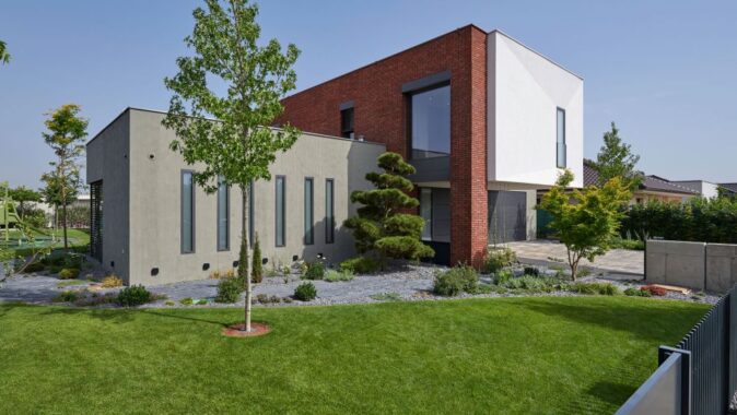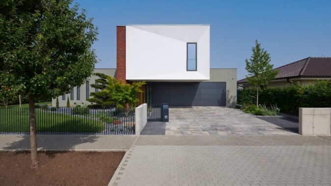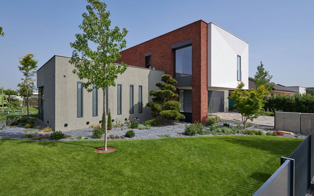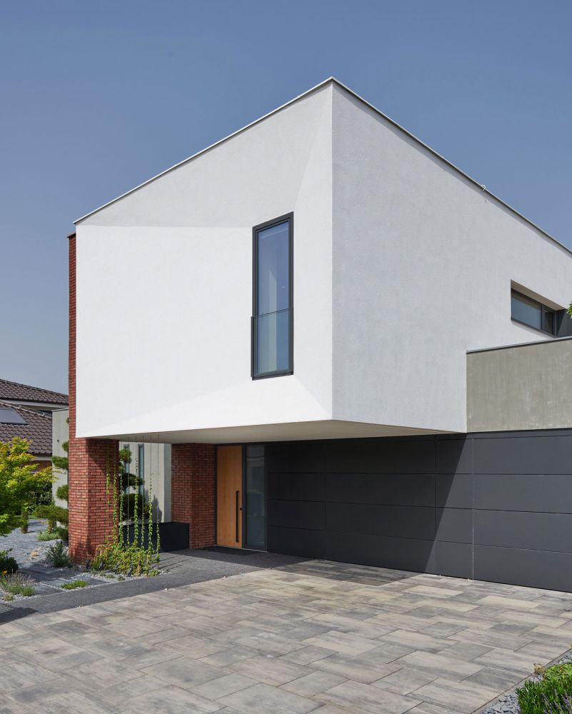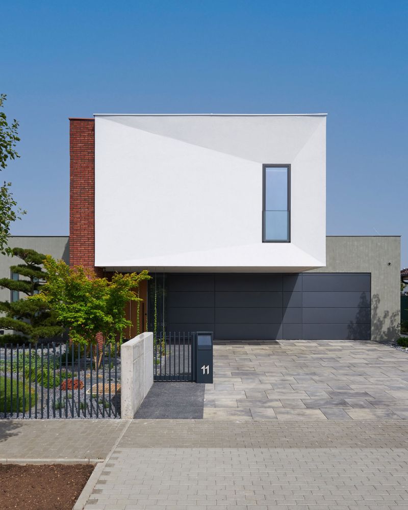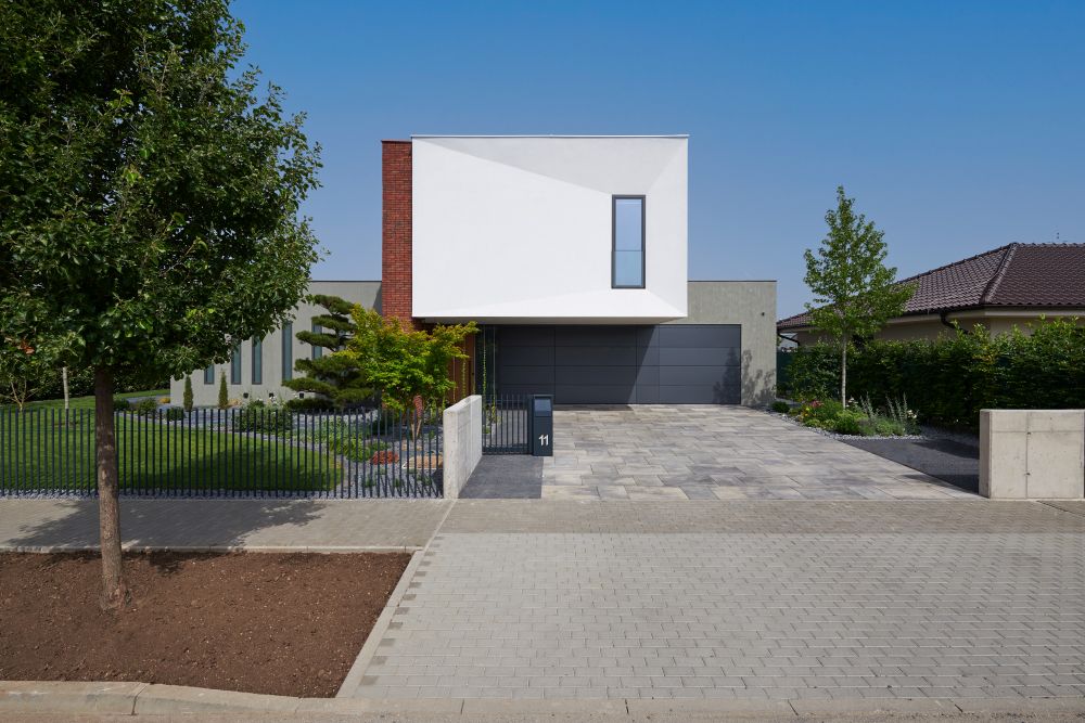 Tento dům definuje kontrast „surových“ materiálů a atmosféry domova. Na první pohled působí jednoduše, ale uplatnili jsme tu řadu jedinečných řešení, téměř všechny prvky jsme navrhli na míru. Jeho vzhled určuje hra tvarů a materiálů; poměrně objemnou hmotu stavby jsme členili na snadno čitelné prvky v příjemném měřítku. Z ulice zaujme řešení fasády – okno pracovny vytvořilo šikminy, které symbolizují vizionářský styl práce. Omítka v imitaci betonu není tak nápadná, ale kromě pěkného vzhledu má i dobré tepelněizolační vlastnosti. Kombinovali jsme ji s cihlami, rámy oken jsou v antracitové barvě. Vrata do garáže s fasádou lícují, takže působí spíše jako alukobondový obklad. Součástí konceptu bylo také bezrámové sloupkové oplocení. Chrání soukromí, a přitom nabízí pohled do předzahrádky.