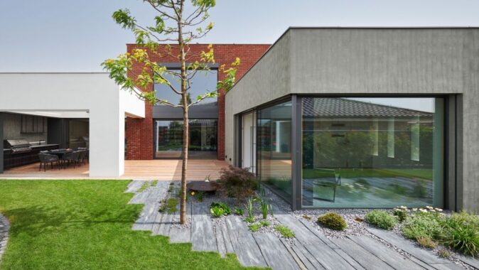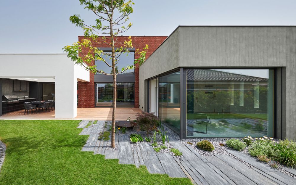 Zahradu jsme rozdělili na několik částí – okrasnou při pohledu z ulice, u bazénu a terasy je místo pro odpočinek. Jsou tu trvalky i travnatá plocha pro děti. Za domem byly vysazeny ovocné stromy. Z další strany jsou v zahradě ukryty technické prvky, jako například tepelné čerpadlo. Významnou část zahrady tvoří terasa, kterou je možno zastínit pomocí lamel nebo screenových rolet.