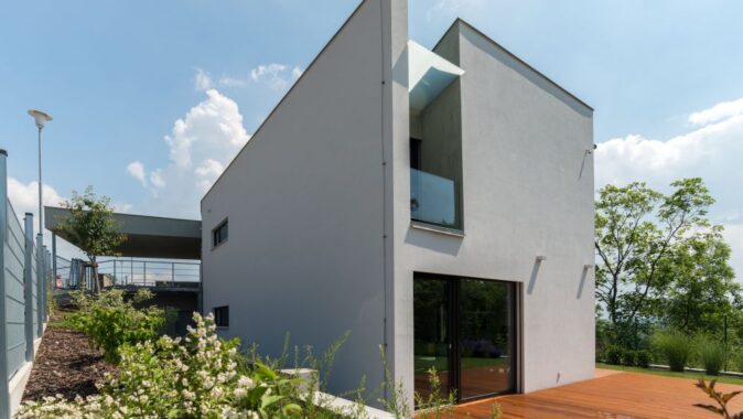 domy. Poslední nezastavěný pozemek měl trojúhelníkový tvar s převýšením přes