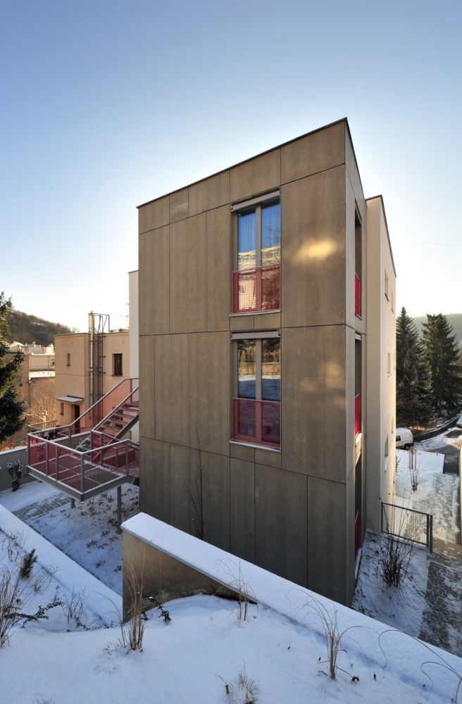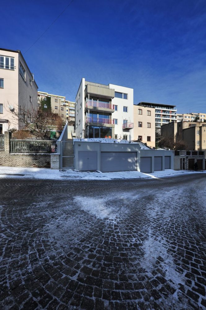 Od jižně položené ulice je dům oddělen značným převýšením, zahrada byla vyzdvižena na střechu garáží, které pozemek uzavírají vůči ulici. Cílem bylo zachovat i po přestavbě čitelnost původního objemu a jednoduché stavitelské tvarosloví. Architektonický koncept přestavby vychází z principu, kdy dochází k hmotovému navýšení původního objemu ve shodném materiálu a duchu, následně pomyslnému oddělení jeho západního průčelí, které je „odsunuto“ a zůstává rovněž materiálově v duchu původní stavby. Do vzniklého prostoru pak byla vložena nová hmota, která je formálně i materiálově odlišná – fasádní cementotřískové desky, velké plochy prosklení a venkovní rolety v barvě fasád. Přesahuje půdorysnou stopu původního domu jižním i severním směrem. Na jižní straně tak vznikly stíněné lodžie a v posledním podlaží terasa pro mezonetový byt.