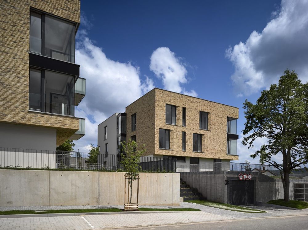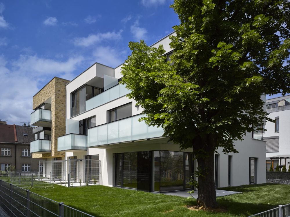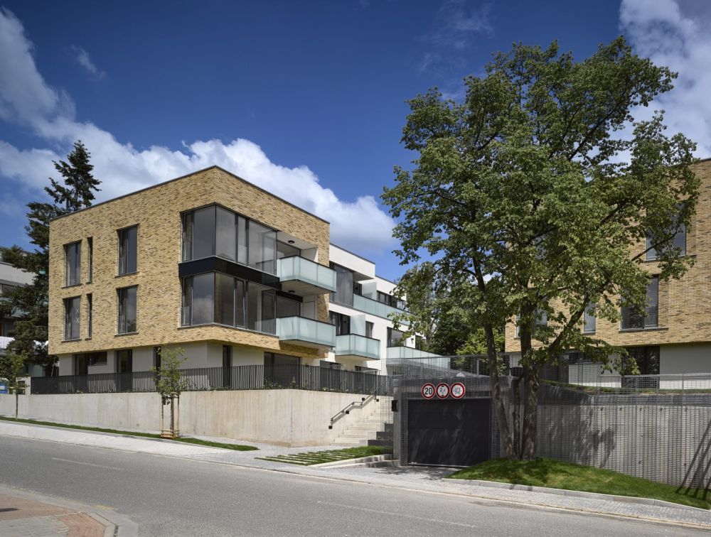 Idea dvojpodlažního kvádru je podpořena světlým cihlovým obkladem. Naopak jižní a východní průčelí do zahrady byly navrženy jako volné kompozice prosklených ploch a výplňových prvků v bílé omítce mezi nimi. Uskočené části vyšších podlaží vytvářejí terasy a balkony.