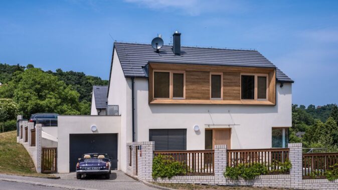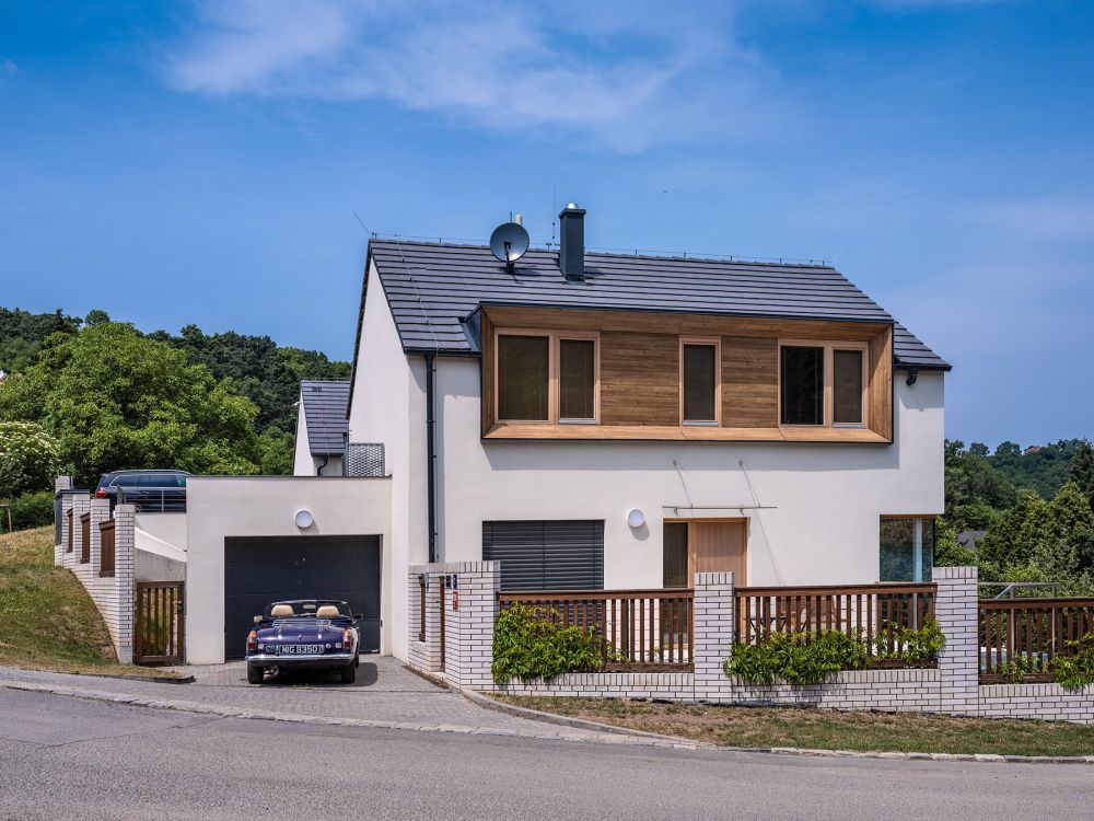 Základní kompozici hmot mají domy stejnou, liší se v dílčích částech jako je vstup, vjezd, venkovní opěrně stěny nebo schodiště.