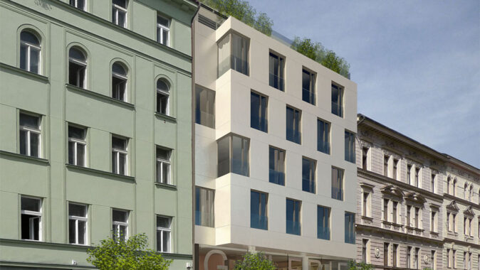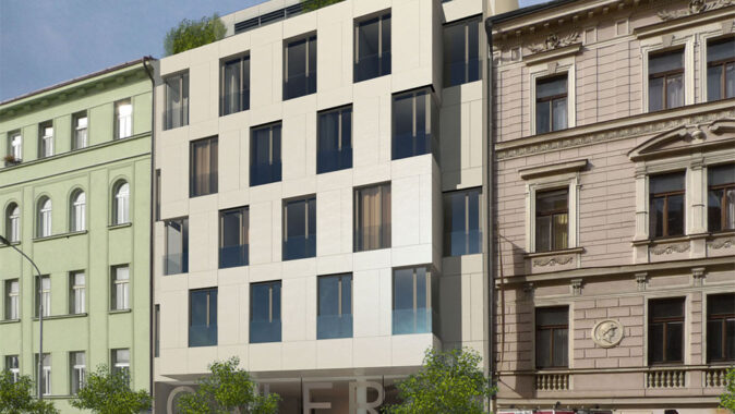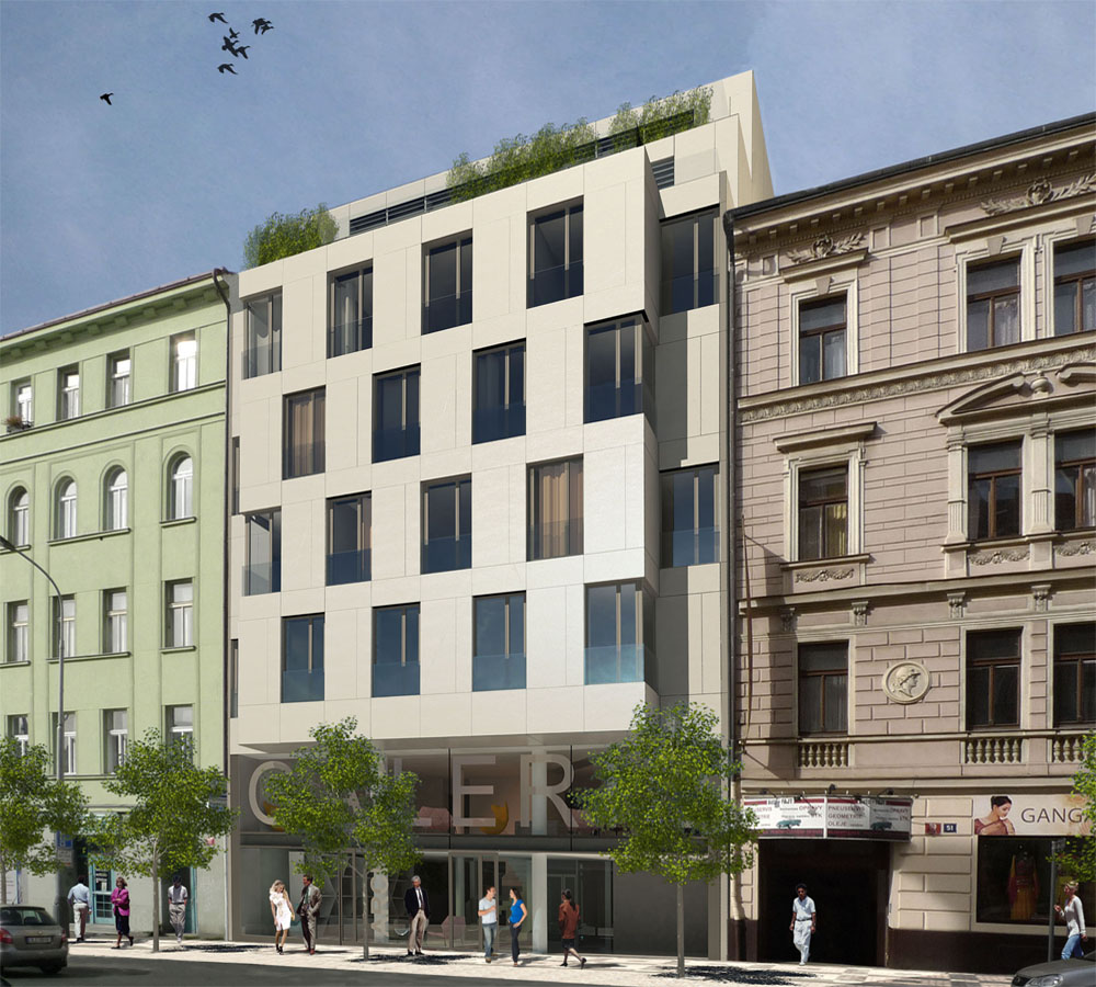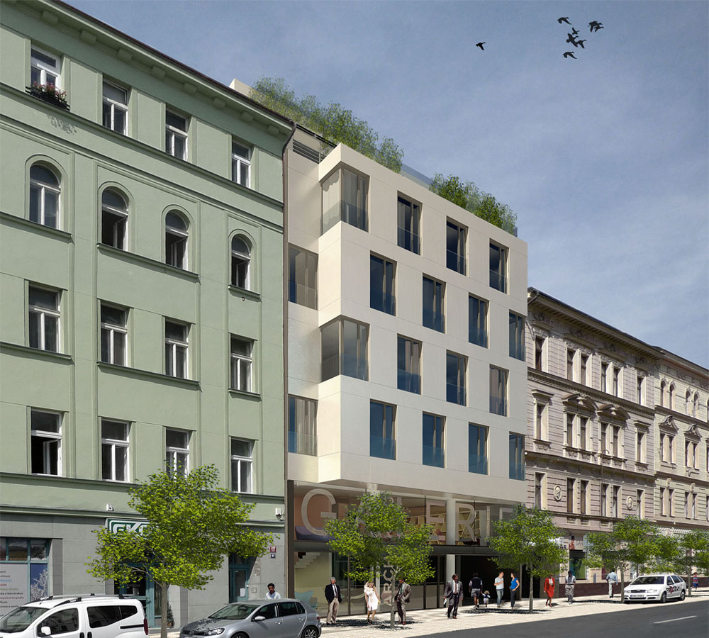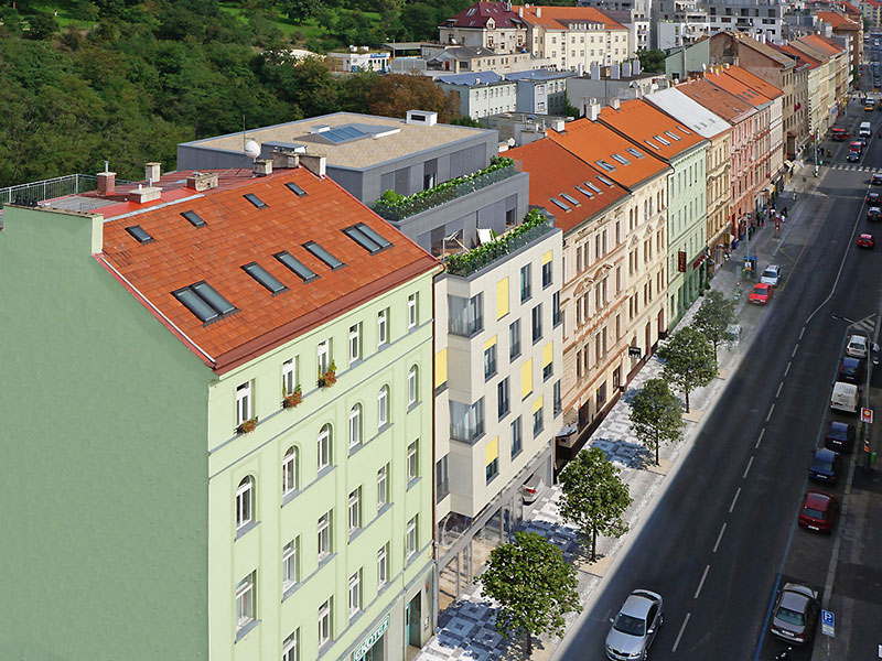 Uliční osmipodlažní objekt v proluce mezi dvěma činžovními domy a