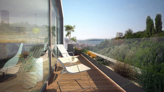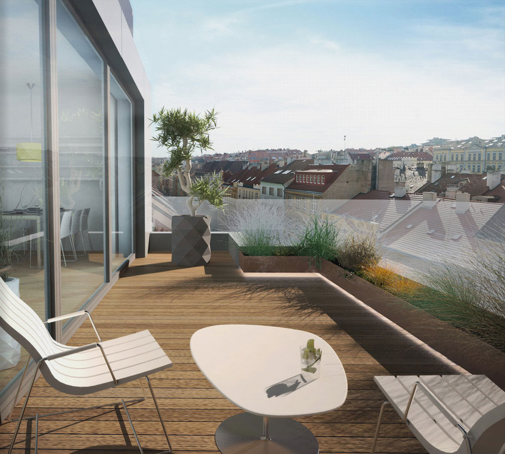 bytům náleží balkony nebo velkorysé terasy u bytů ve vyšších patrech.