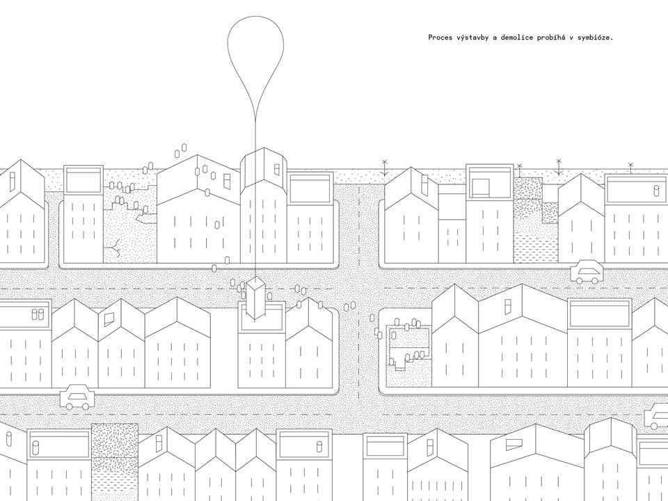 Druhé místo získal tým ve složení Nekola, Marek a Šustek z liberecké FUA TUL s ideou, která si pohrávala s tenkou hranicí mezi výstavbou a demolicí. Vznášející se robotický modul by podle jejich idei těžil stavební materiál z budov určených k demolici a na jiném místě by při zachování „paměti materiálu či místa“ dodal materiál na výstavbu budovy nové.