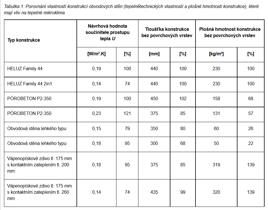 létě dosaženo dobré tepelné pohody. V tabulce 1 je porovnání vlastností