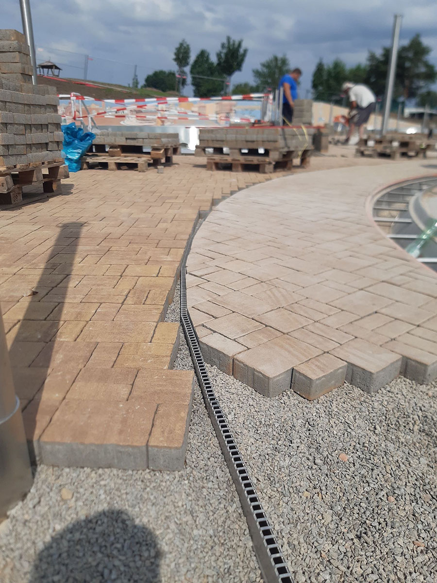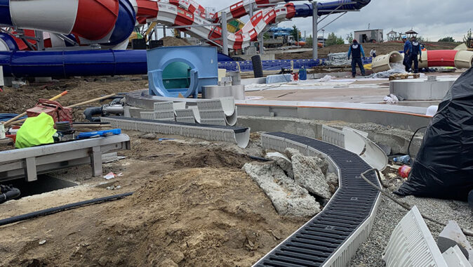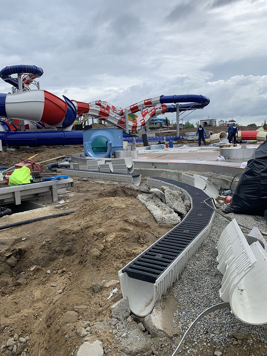 O to se starají liniové štěrbinové žlaby MEA TSH. Štěrbina je na povrchu bezpečná pro chůzi a podpovrchové žlaby MEARIN 200 mají dostatečnou kapacitu i pro velké množství vody z atrakcí. Kolem celého dětského brouzdaliště jsou navrženy žlaby MEARIN TSH 200 v obloucích v malých poloměrech v délce cca 200 m. Montážníci si musí poradit i s velmi ostrým zakřivením, takže na některých místech musí štěrbiny zkracovat i na 50 cm. Žlaby MEARIN z kompozitního materiálu SMC usnadňují montáž i atypických tvarů. Kompozitní materiál je lehký a snadno zpracovatelný, takže nekomplikuje náročnost úprav odvodnění ve složitých tvarech. Návrh systému prošel projekční přípravou MEA.