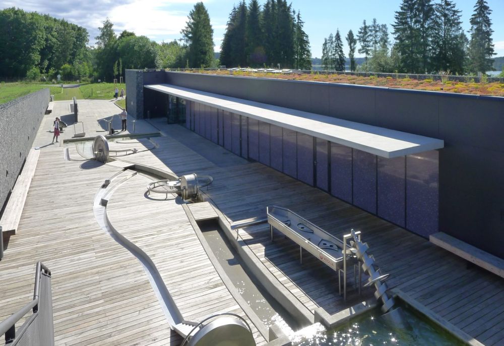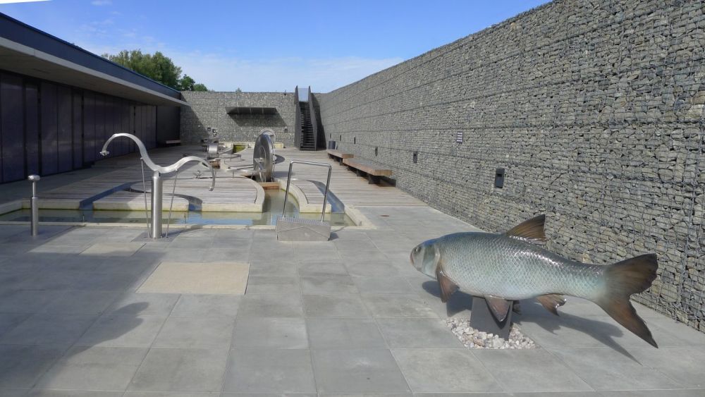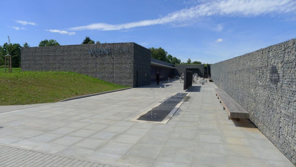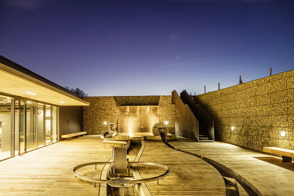 Objekt vymezují kamenné gabionové stěny na obdélném půdorysu, uvnitř stěn je samotný dům a navazující atrium. Z atria může návštěvník vstoupit do vnitřní expozice nebo po subtilním ocelovém schodišti vystoupat na naučnou stezku kolem expoziční nádrže, mokřadu, suchého poldru a dalších zajímavostí. Atrium nabízí venkovní expozici s vodními hrátkami, fontánami a vodopádem. Ve dřevěné palubě jsou nerezová a betonová korýtka s proudící vodou, kde si návštěvníci mohou vyzkoušet, jak funguje Archimédův šroub, nebo třeba pustit lodičku. Křivky vodních korýtek a herní vodní prvky vytvářejí kontrast k jednoduché architektuře domu. Jeho interiér také kontrastuje s minimalistickým pojetím exteriéru.